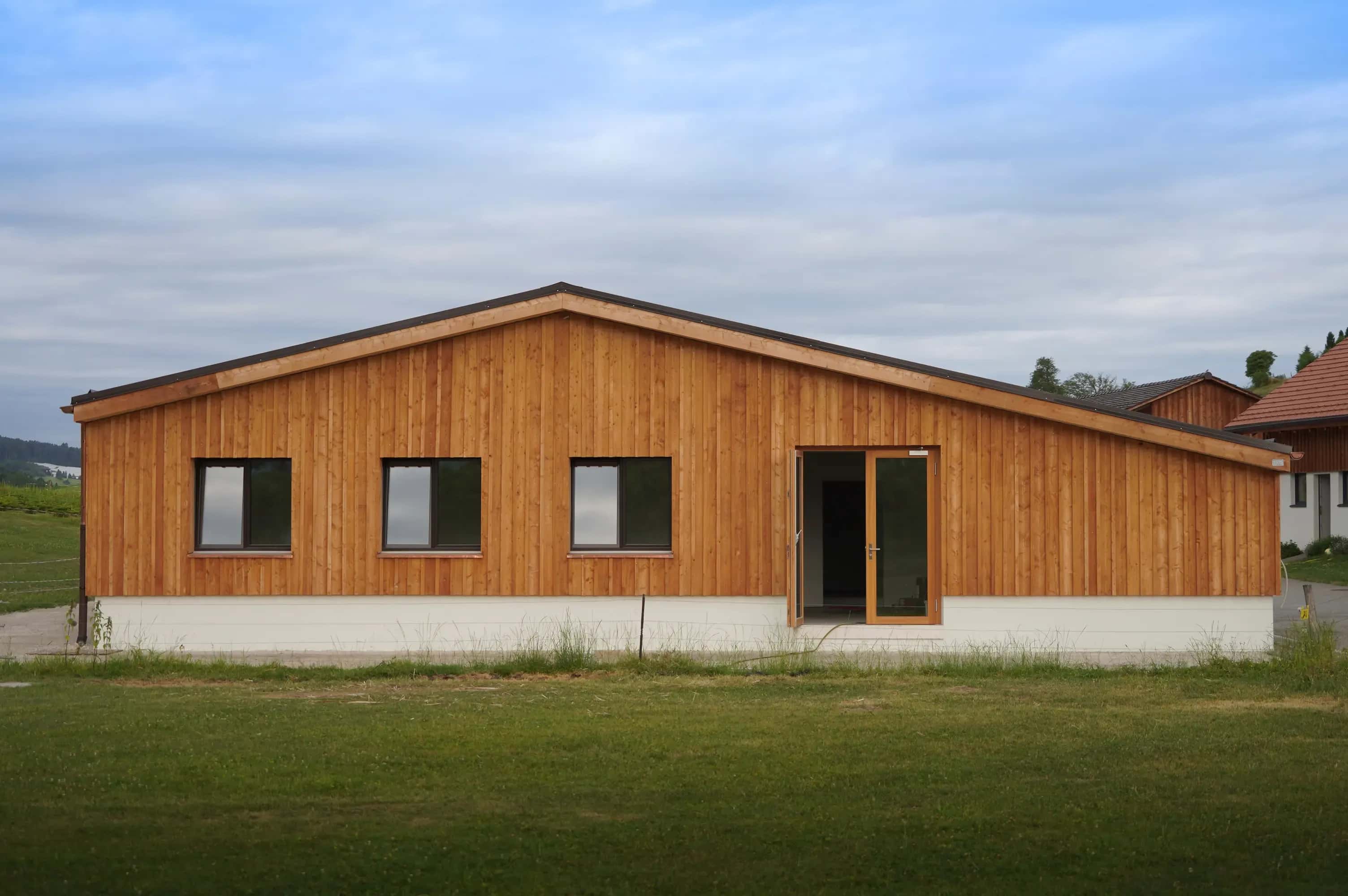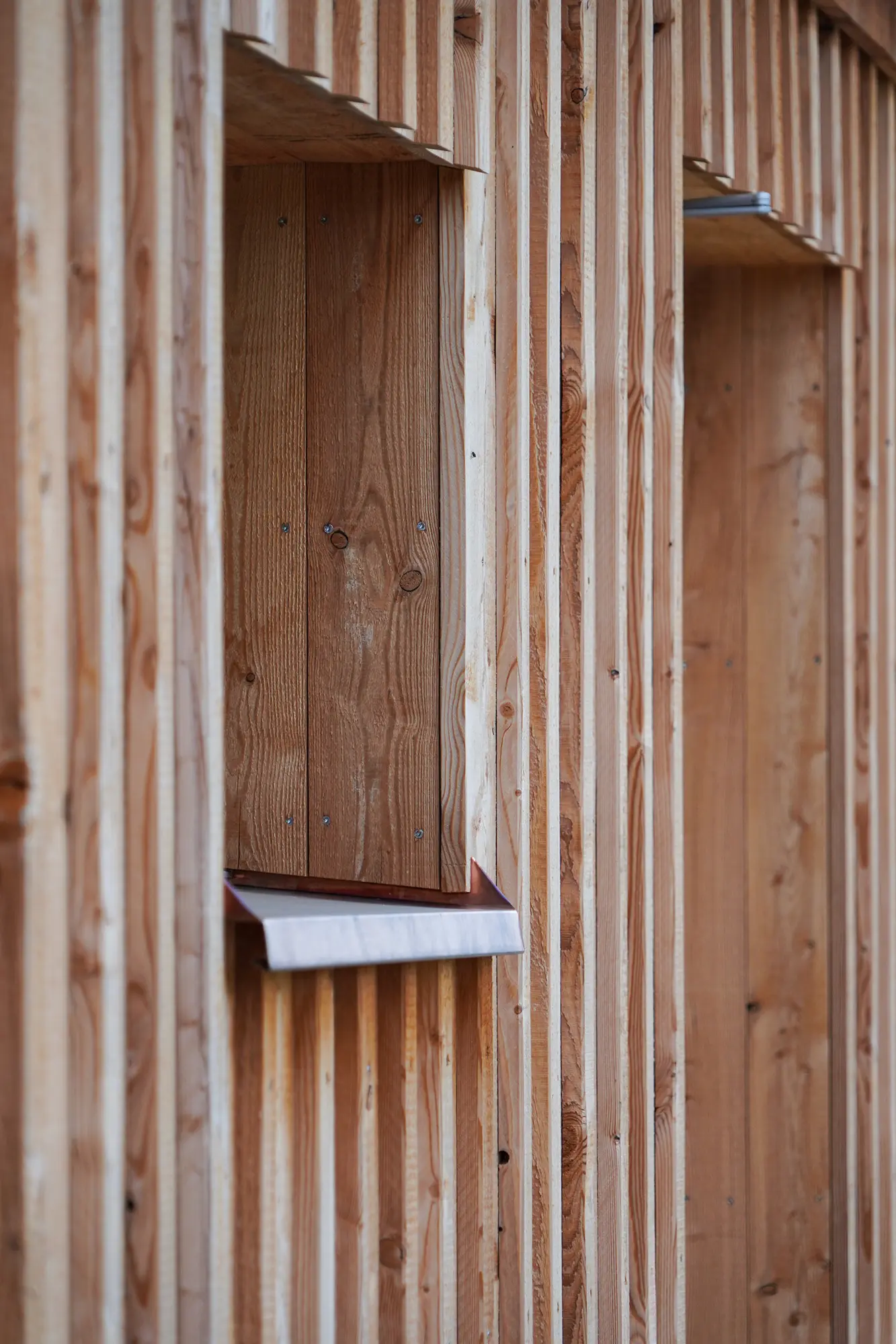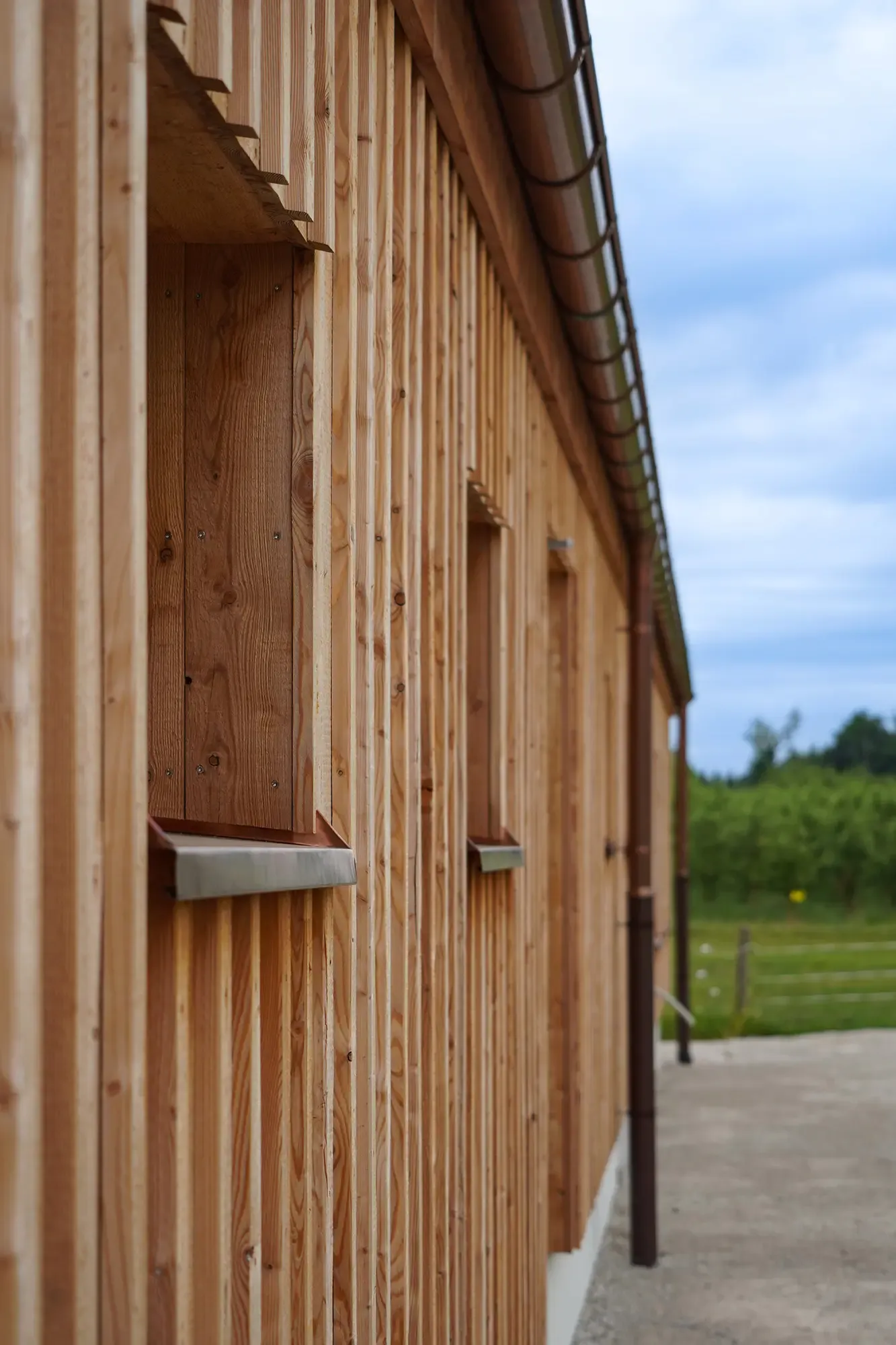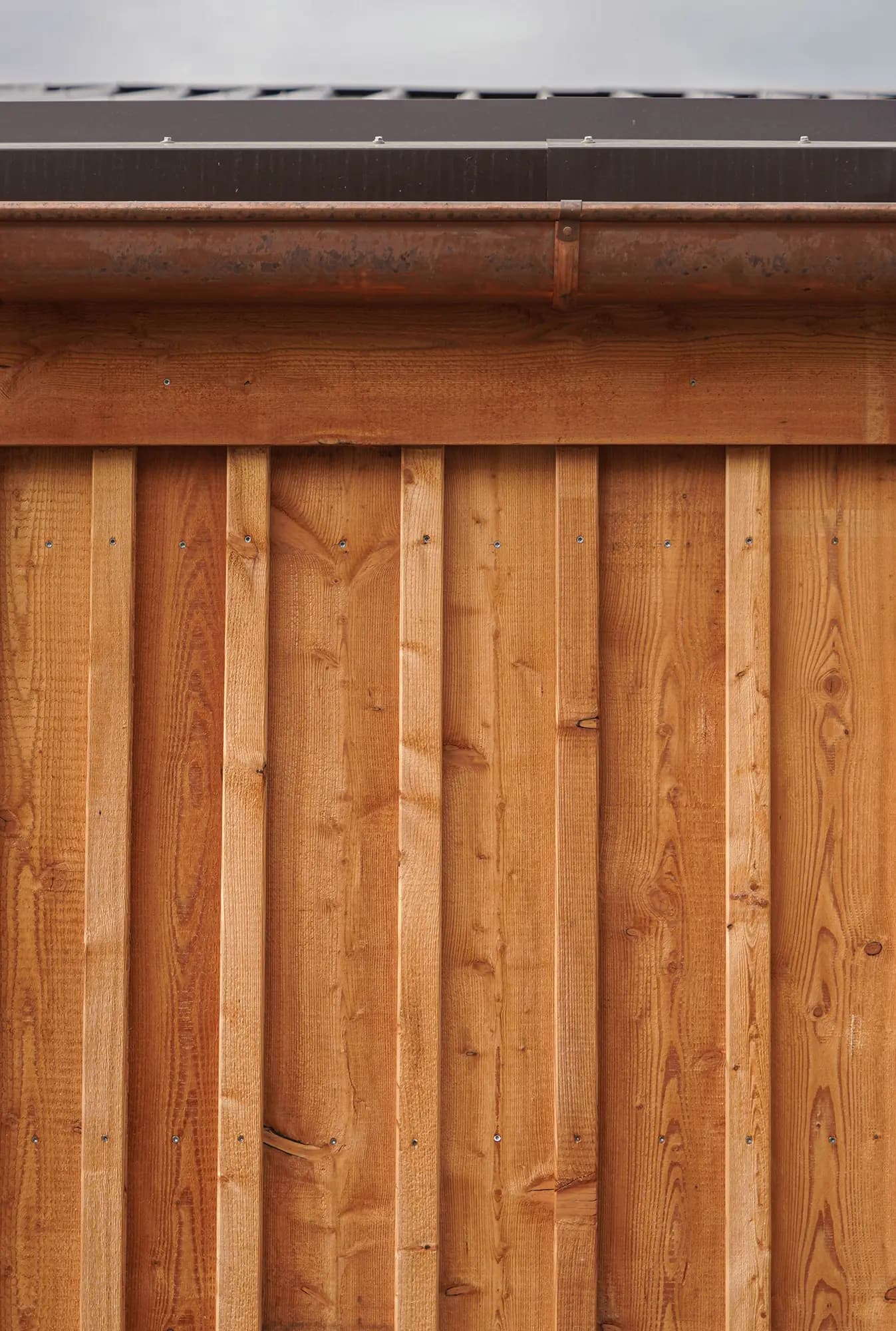 Wo einst Schweine grunzten, werden heute Früchte und Gemüse verkauft: Der alte Stall wurde in den 70er-Jahren vom Vater der Familie Fecker errichtet. Von der alten Bausubstanz stechen im Inneren die genagelten Fachwerkbinder hervor. Ansonsten sind Wände, Decken und Böden zweckmässig schlicht gehalten. Beim Äusseren wurden die sägerohen Deckleistenschalungen – wie bei der erst kürzlich sanierten angrenzenden Scheune und dem Schopf – aus heimischer, sägeroher Lärche hergestellt. Die Dachränder wurden so gestaltet, dass die Dacheindeckung mit Blechpaneelen zurückhaltend in Erscheinung tritt. Die Ortbretter aus naturbelassener Lärche sind für viele Jahrzehnte wartungsfrei.