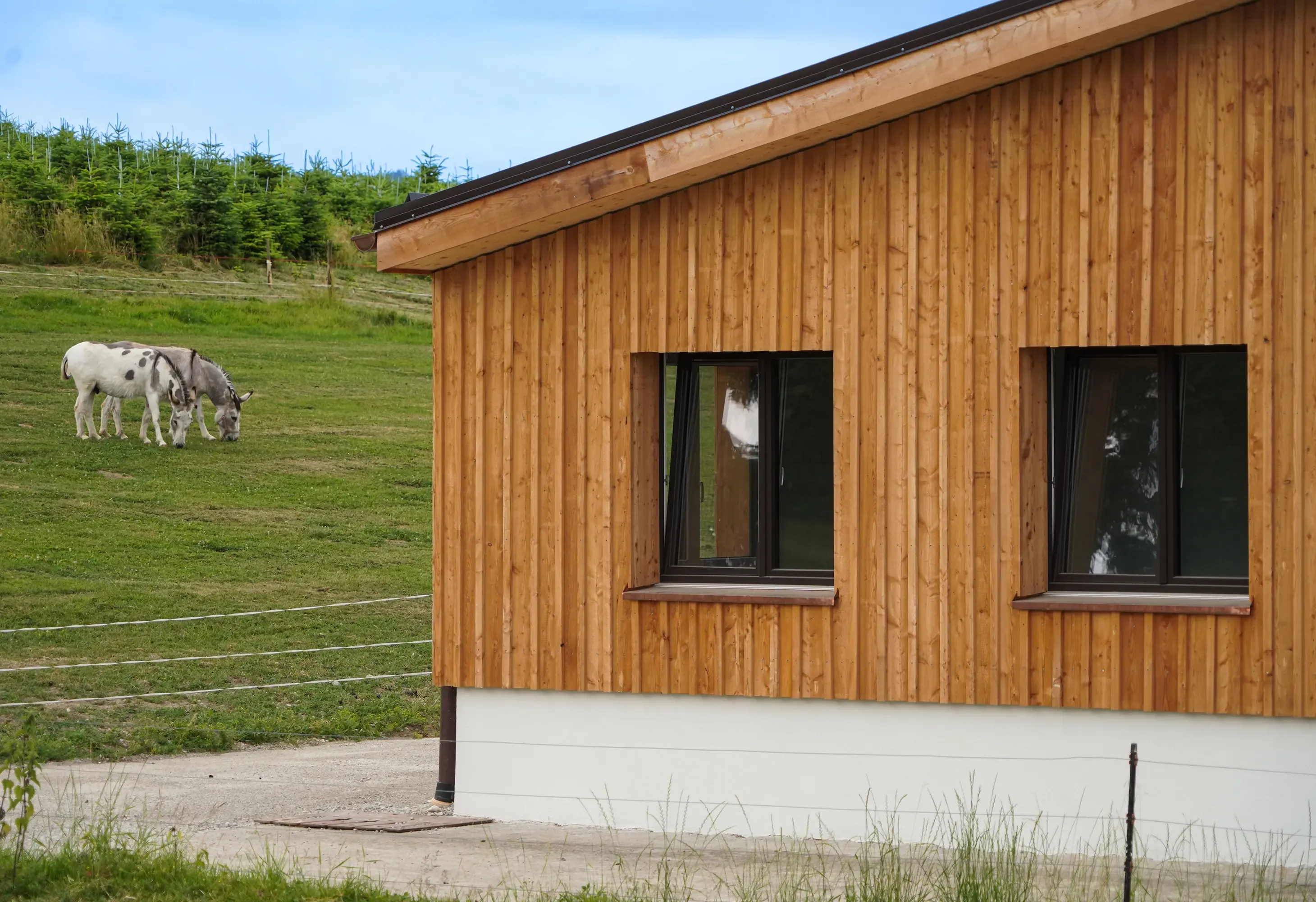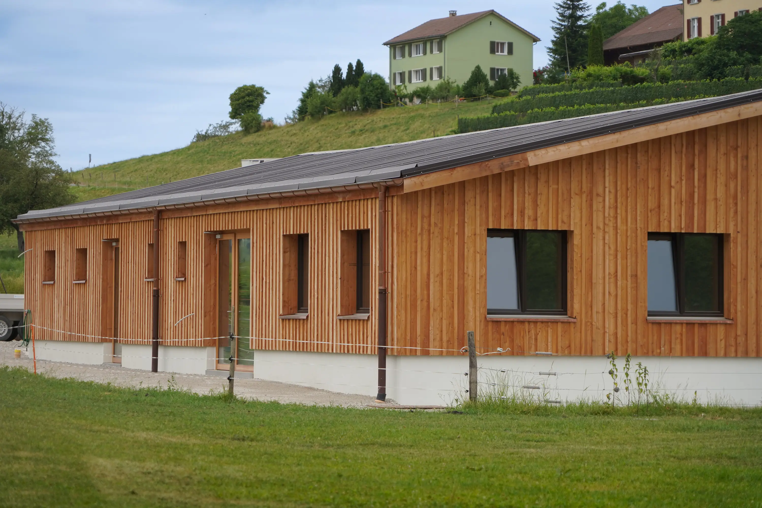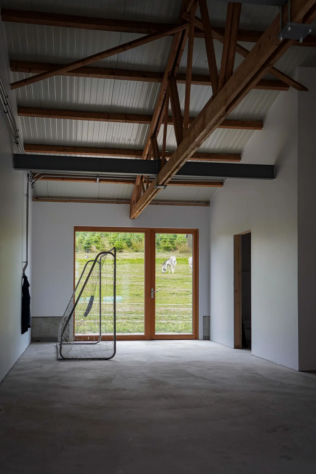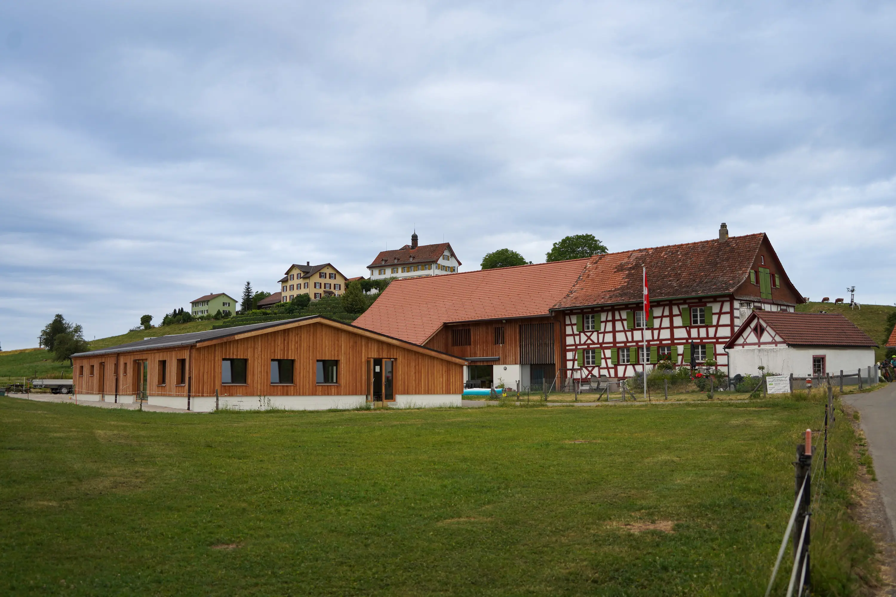 Wo einst Schweine grunzten, werden heute Früchte und Gemüse verkauft: Der alte Stall wurde in den 70er-Jahren vom Vater der Familie Fecker errichtet. Von der alten Bausubstanz stechen im Inneren die genagelten Fachwerkbinder hervor. Ansonsten sind Wände, Decken und Böden zweckmässig schlicht gehalten. Beim Äusseren wurden die sägerohen Deckleistenschalungen – wie bei der erst kürzlich sanierten angrenzenden Scheune und dem Schopf – aus heimischer, sägeroher Lärche hergestellt. Die Dachränder wurden so gestaltet, dass die Dacheindeckung mit Blechpaneelen zurückhaltend in Erscheinung tritt. Die Ortbretter aus naturbelassener Lärche sind für viele Jahrzehnte wartungsfrei.