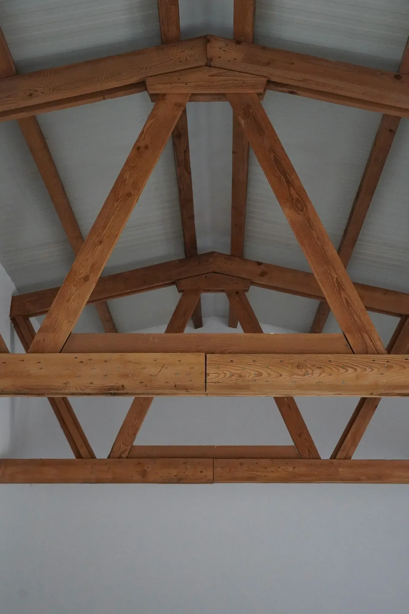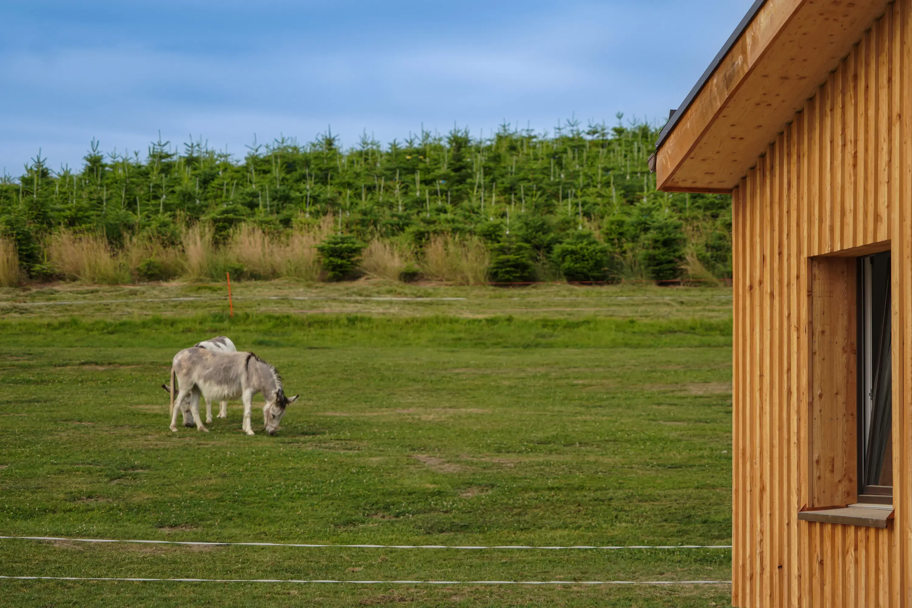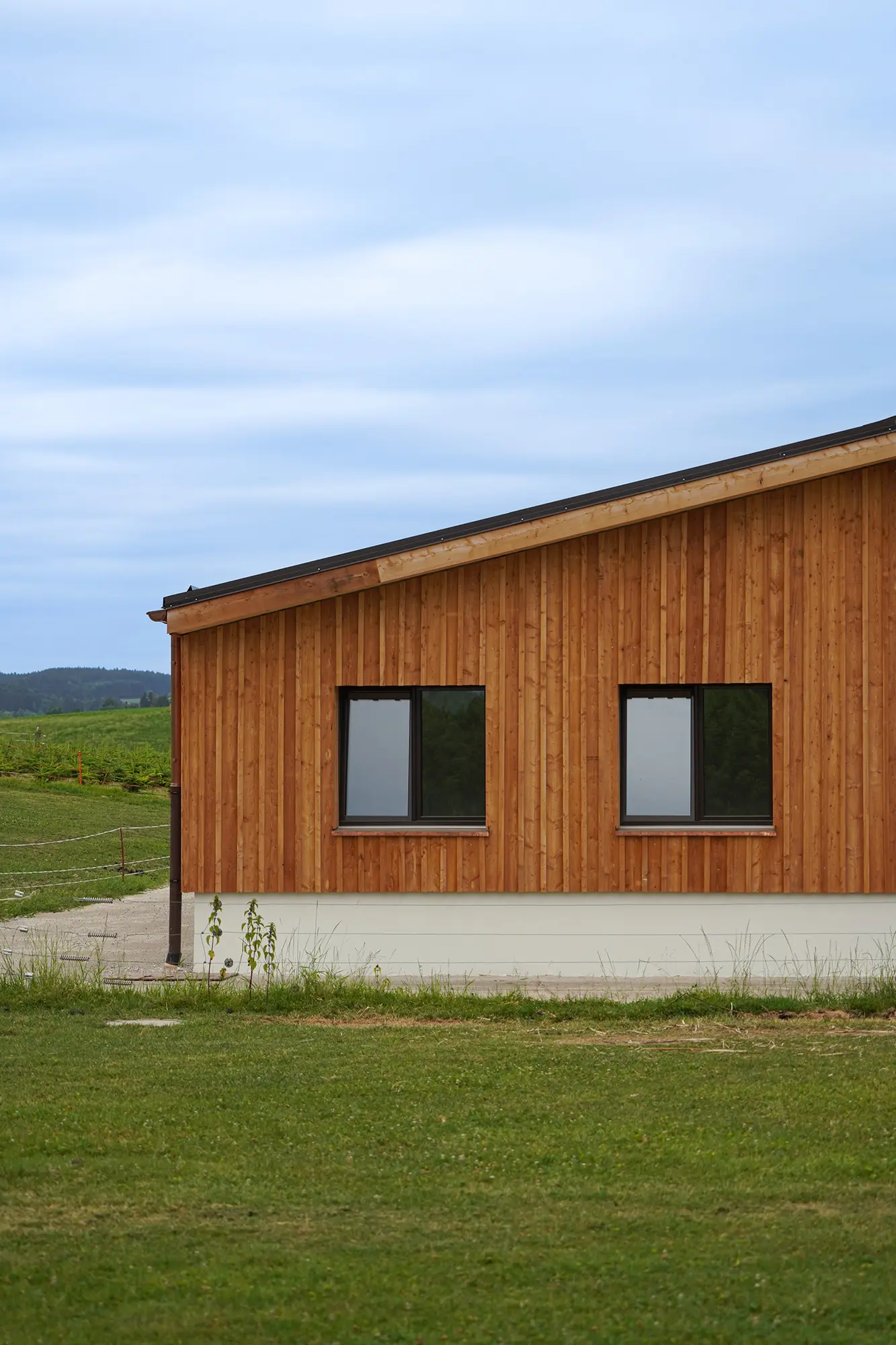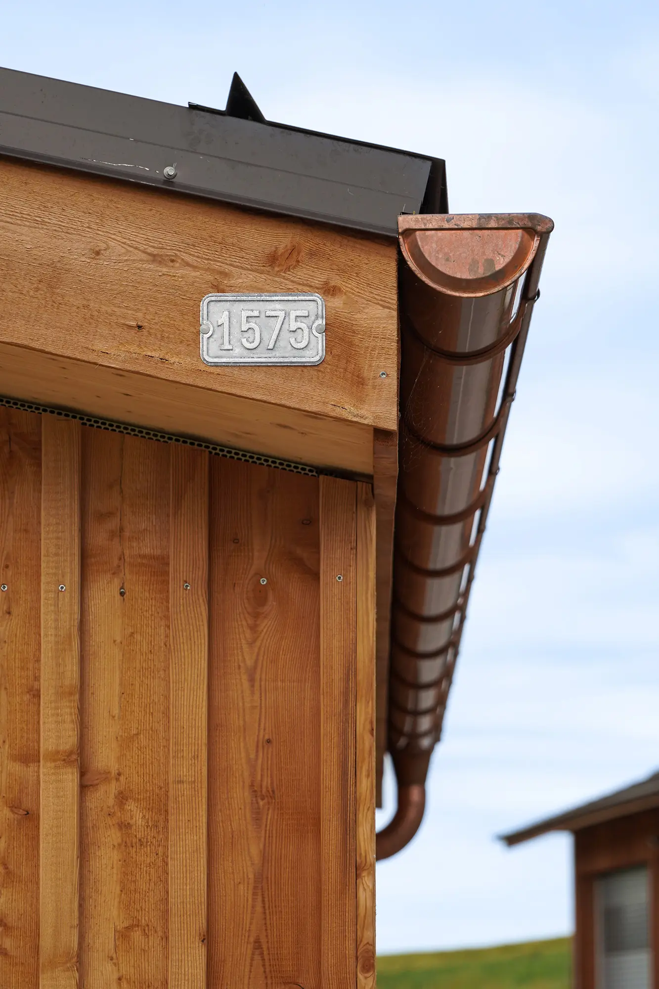 Wo einst Schweine grunzten, werden heute Früchte und Gemüse verkauft: Der alte Stall wurde in den 70er-Jahren vom Vater der Familie Fecker errichtet. Von der alten Bausubstanz stechen im Inneren die genagelten Fachwerkbinder hervor. Ansonsten sind Wände, Decken und Böden zweckmässig schlicht gehalten. Beim Äusseren wurden die sägerohen Deckleistenschalungen – wie bei der erst kürzlich sanierten angrenzenden Scheune und dem Schopf – aus heimischer, sägeroher Lärche hergestellt. Die Dachränder wurden so gestaltet, dass die Dacheindeckung mit Blechpaneelen zurückhaltend in Erscheinung tritt. Die Ortbretter aus naturbelassener Lärche sind für viele Jahrzehnte wartungsfrei.