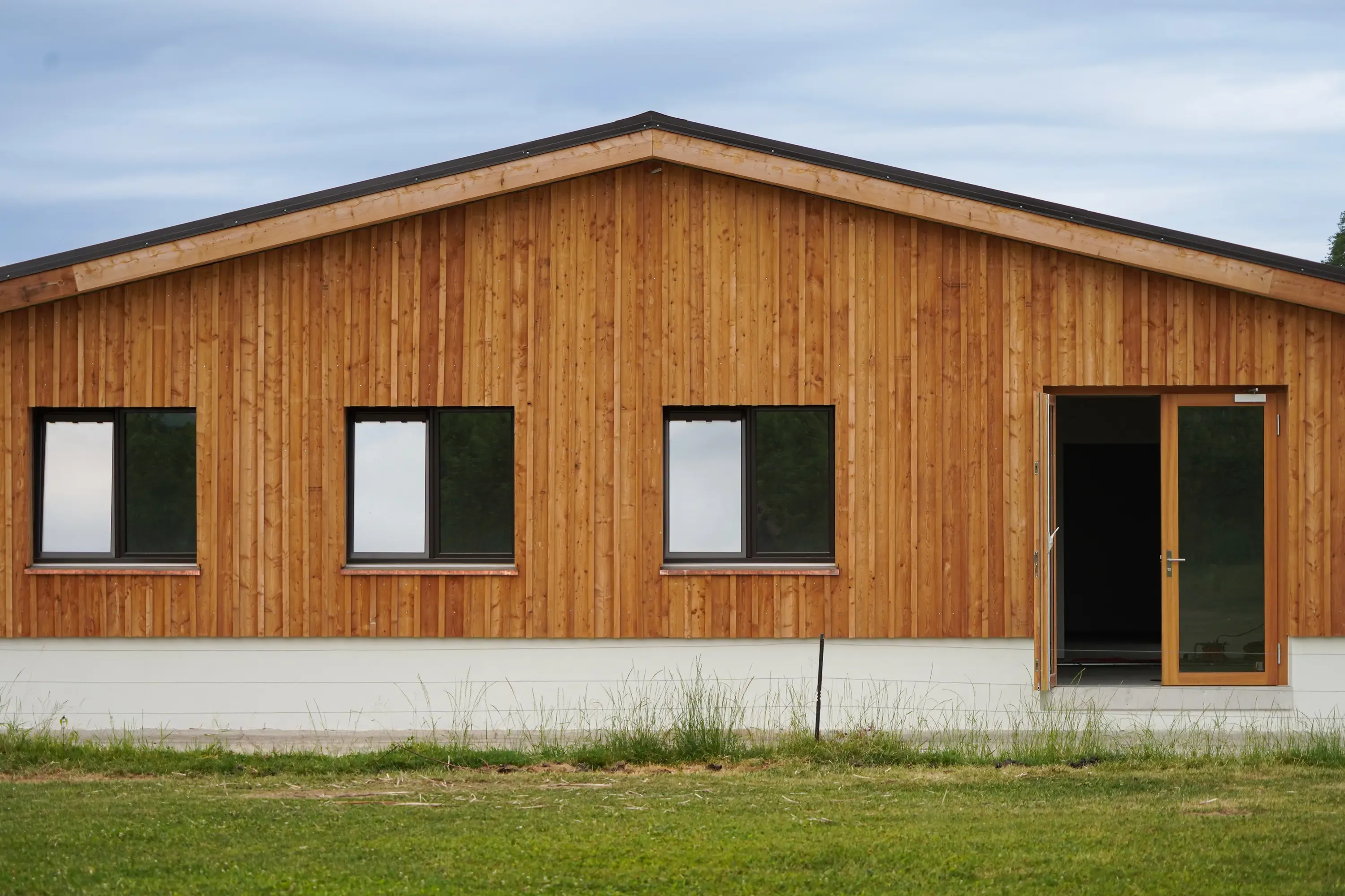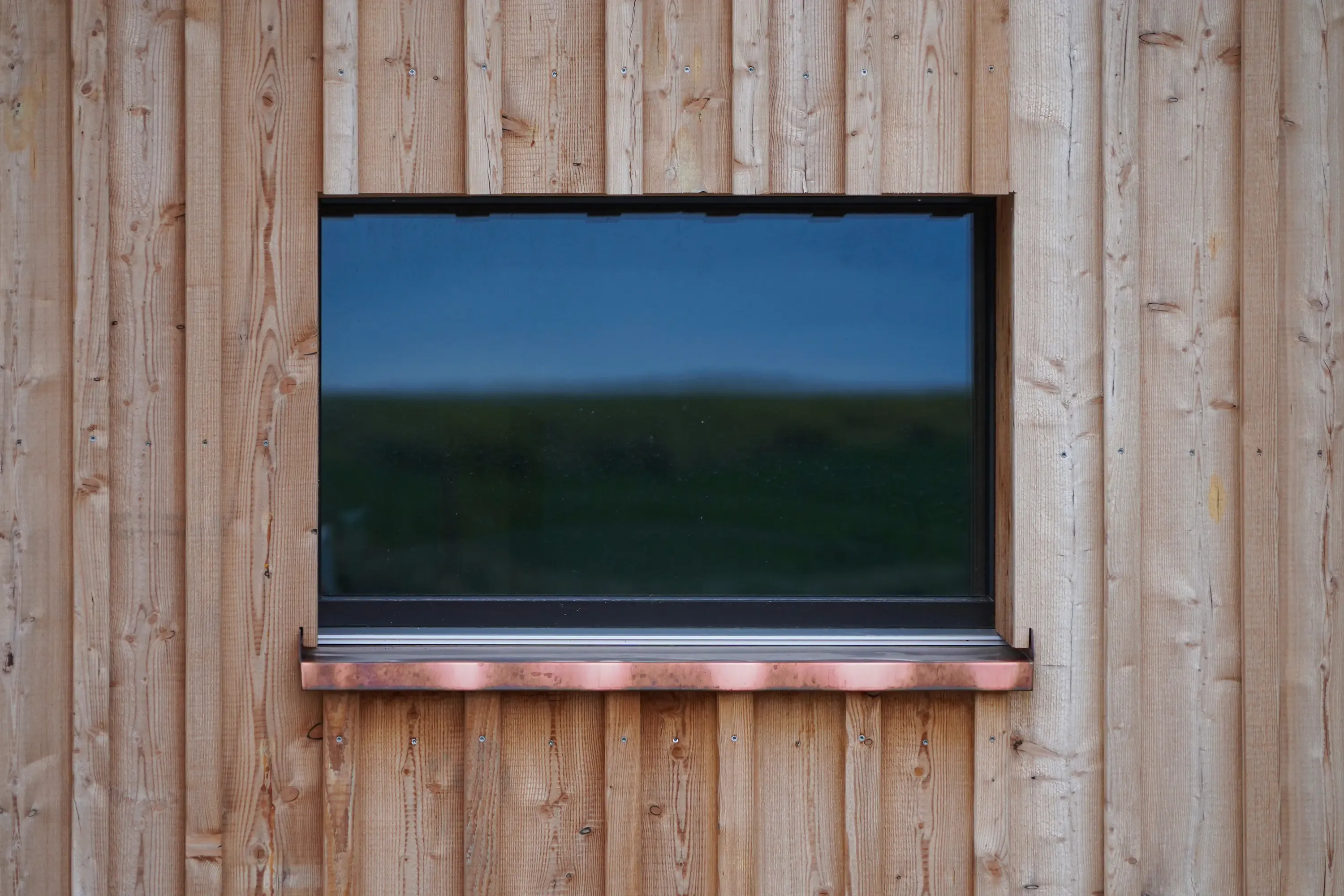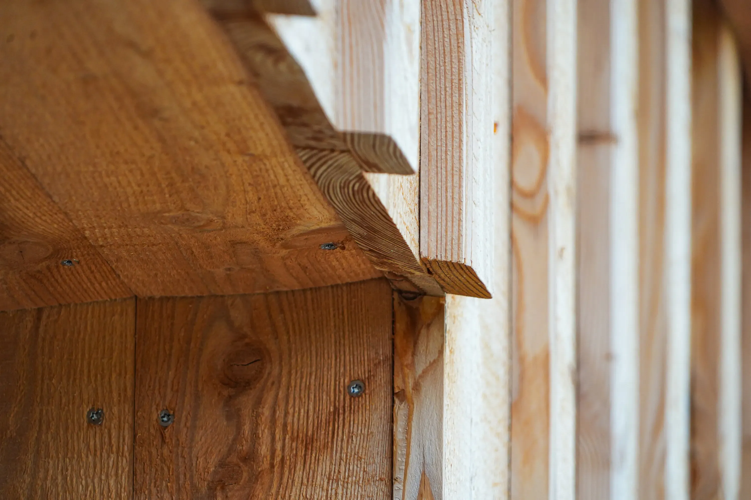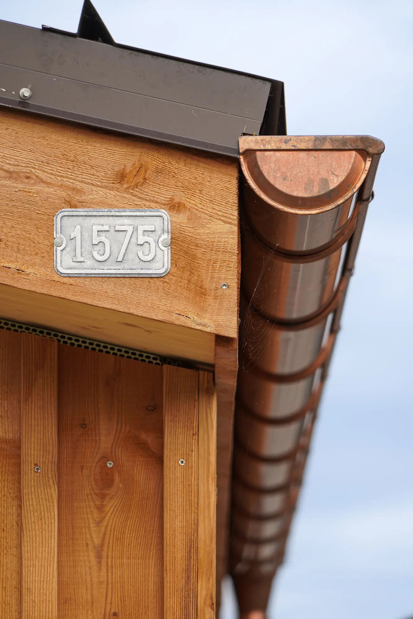 Wo einst Schweine grunzten, werden heute Früchte und Gemüse verkauft: Der alte Stall wurde in den 70er-Jahren vom Vater der Familie Fecker errichtet. Von der alten Bausubstanz stechen im Inneren die genagelten Fachwerkbinder hervor. Ansonsten sind Wände, Decken und Böden zweckmässig schlicht gehalten. Beim Äusseren wurden die sägerohen Deckleistenschalungen – wie bei der erst kürzlich sanierten angrenzenden Scheune und dem Schopf – aus heimischer, sägeroher Lärche hergestellt. Die Dachränder wurden so gestaltet, dass die Dacheindeckung mit Blechpaneelen zurückhaltend in Erscheinung tritt. Die Ortbretter aus naturbelassener Lärche sind für viele Jahrzehnte wartungsfrei.