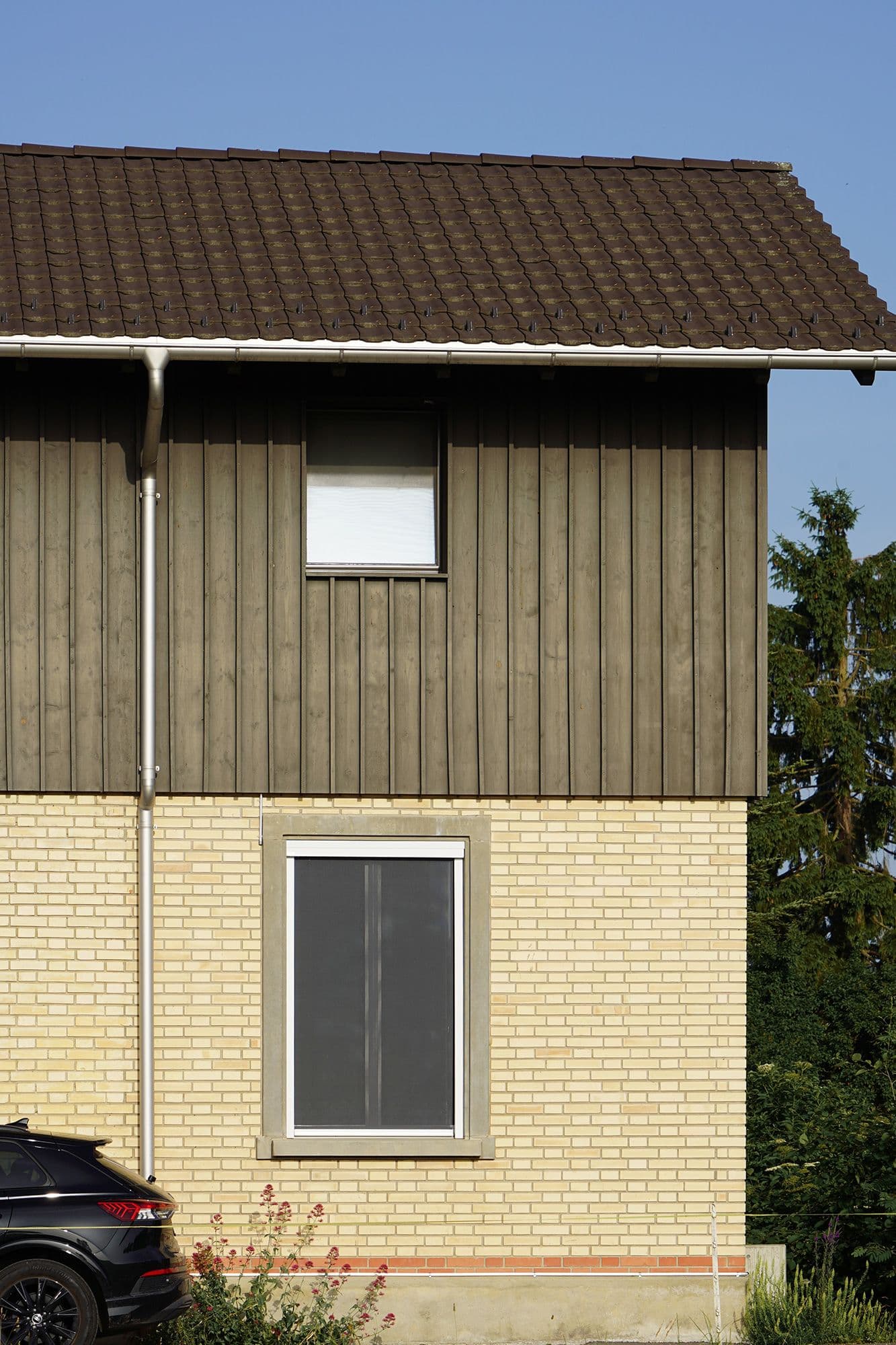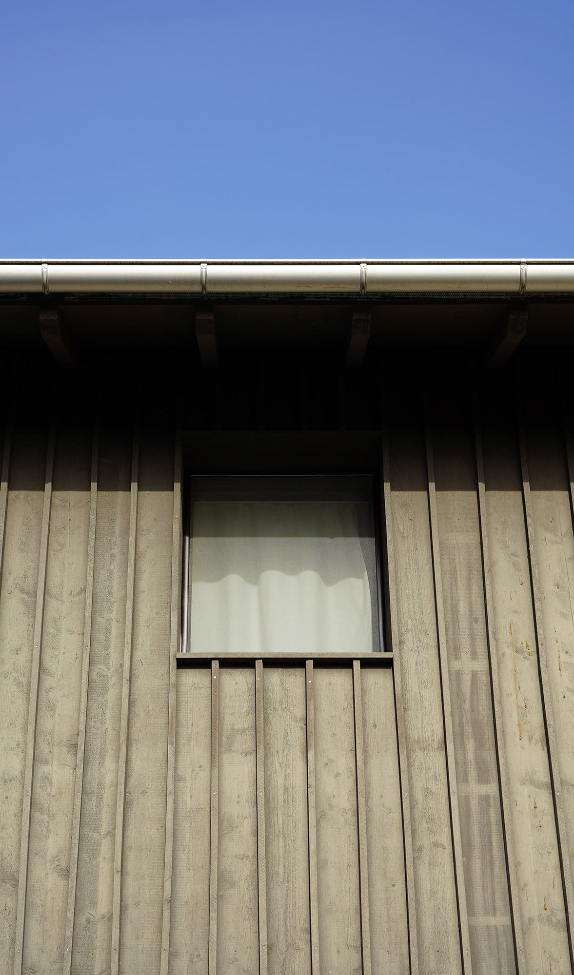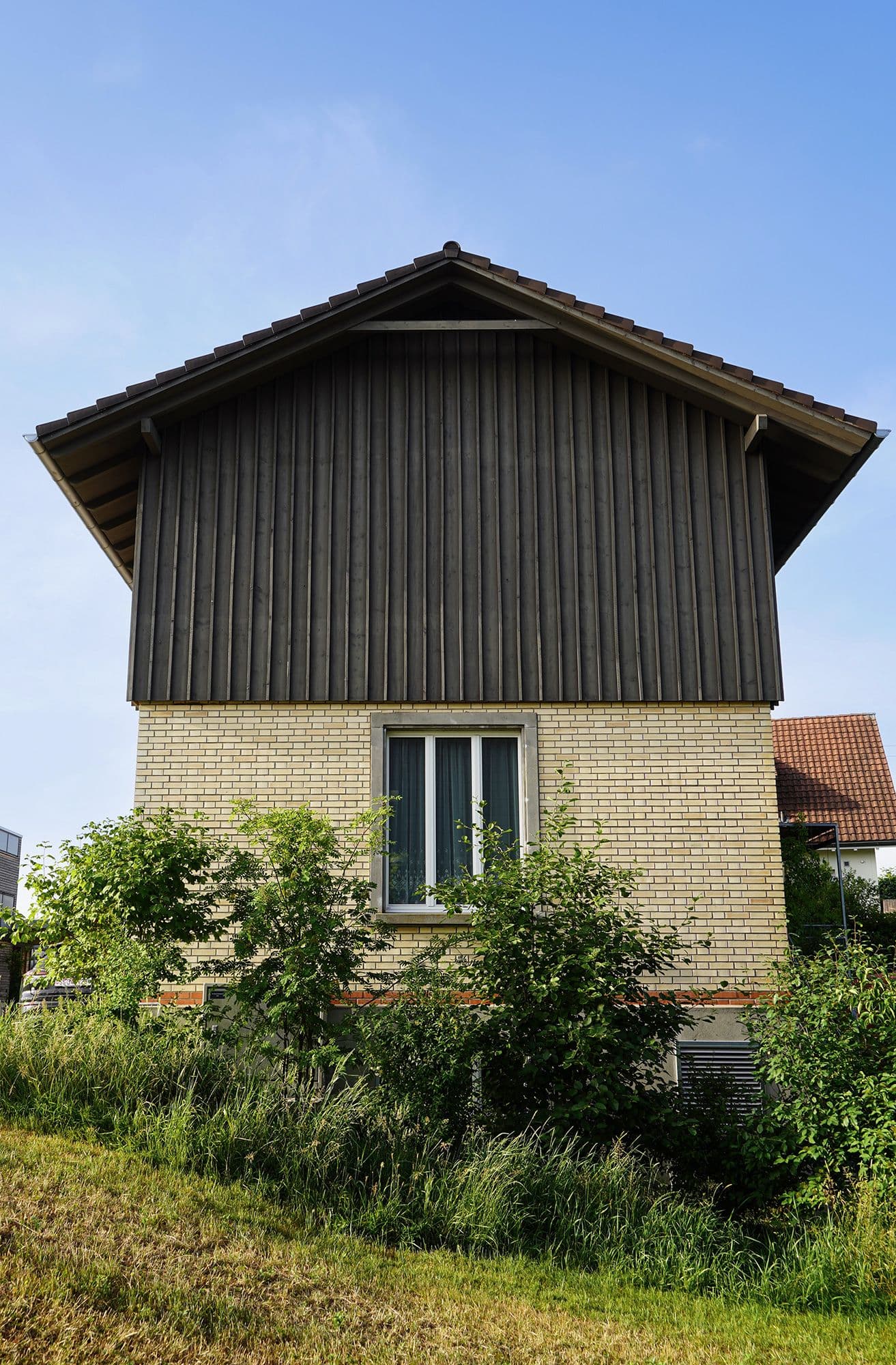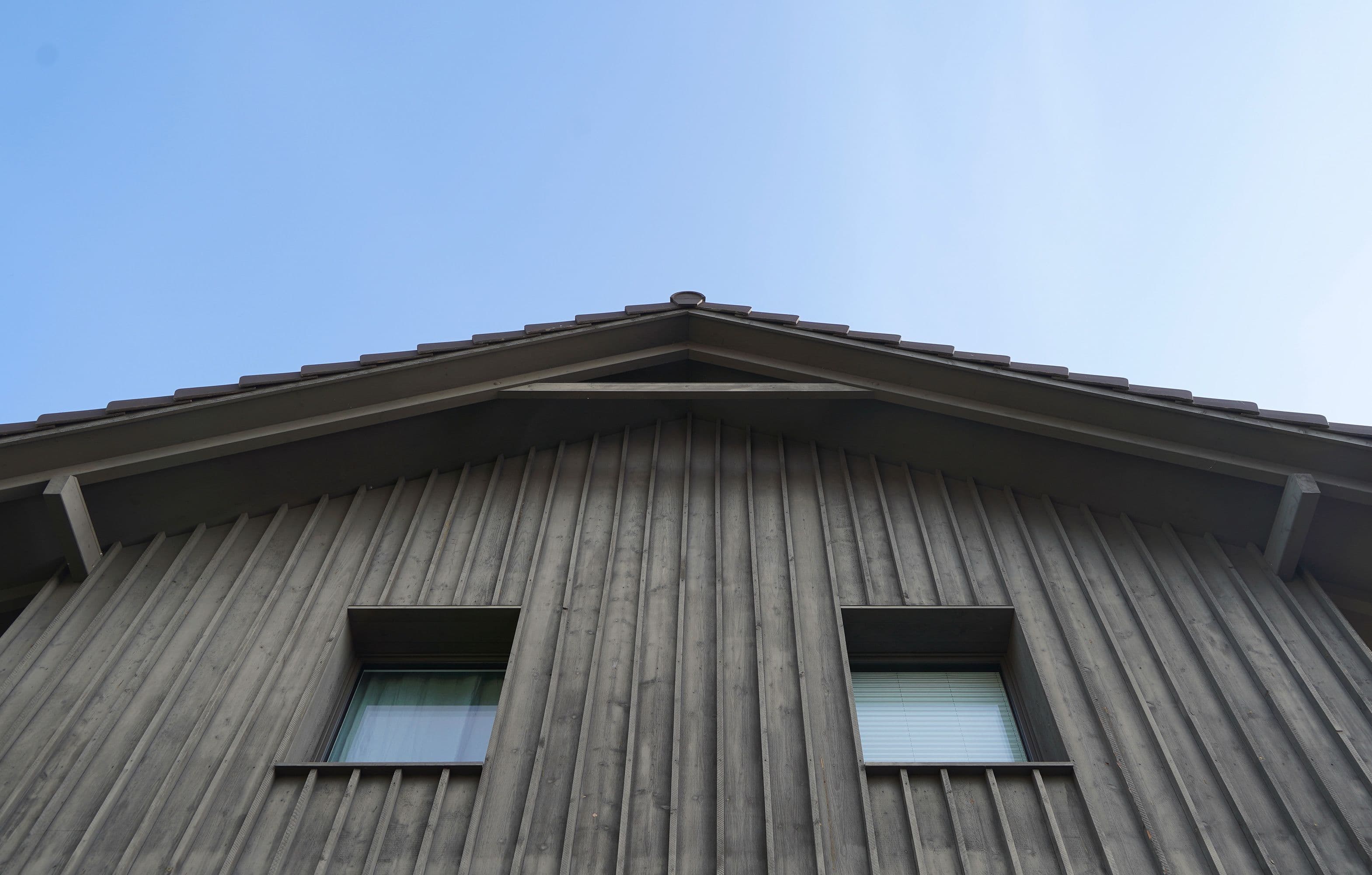Auf den ersten Blick wirkt dieses Haus unscheinbar. Ein altes, längliches Industriegebäude, dem ein hölzerner Hut aufgesetzt wurde. Drinnen offenbart sich jedoch ein anderes Bild: ein lichtdurchflutetes Wohnhaus mit einem offenen Wohnzimmer, einem schwarzen, modernen Kern mit Küche und Holztreppe sowie einem Obergeschoss mit zwei Zimmern, einem Büro und einer prägnanten Holzbalkendecke. Der Fassade aus Fichtenholz wurde ein schlammfarbener Anstrich verpasst, was das Gebäude modern wirken lässt.