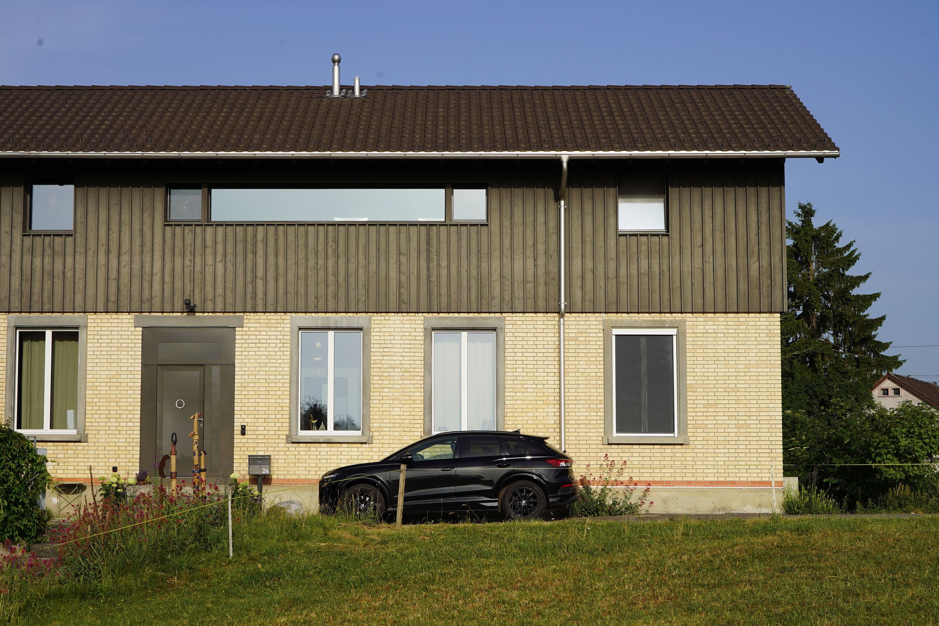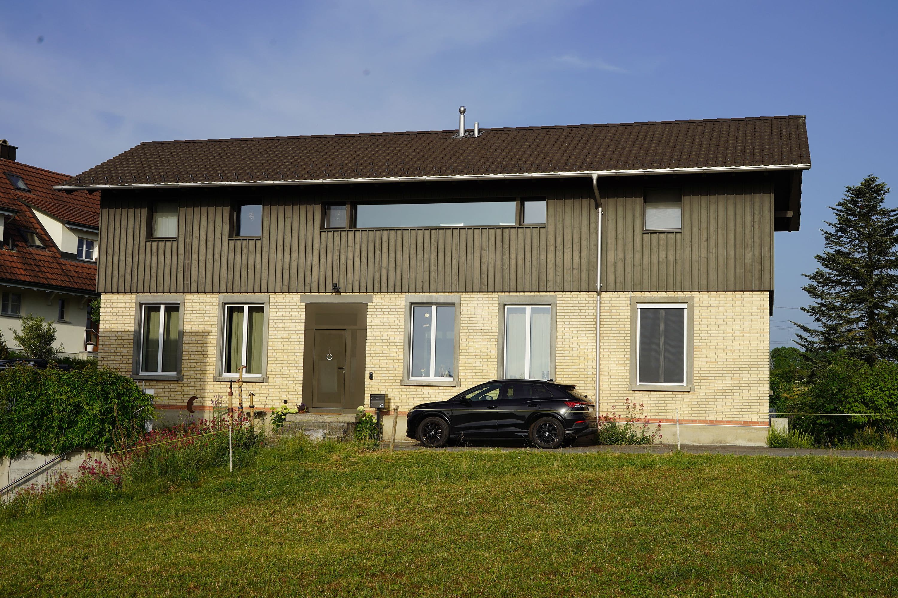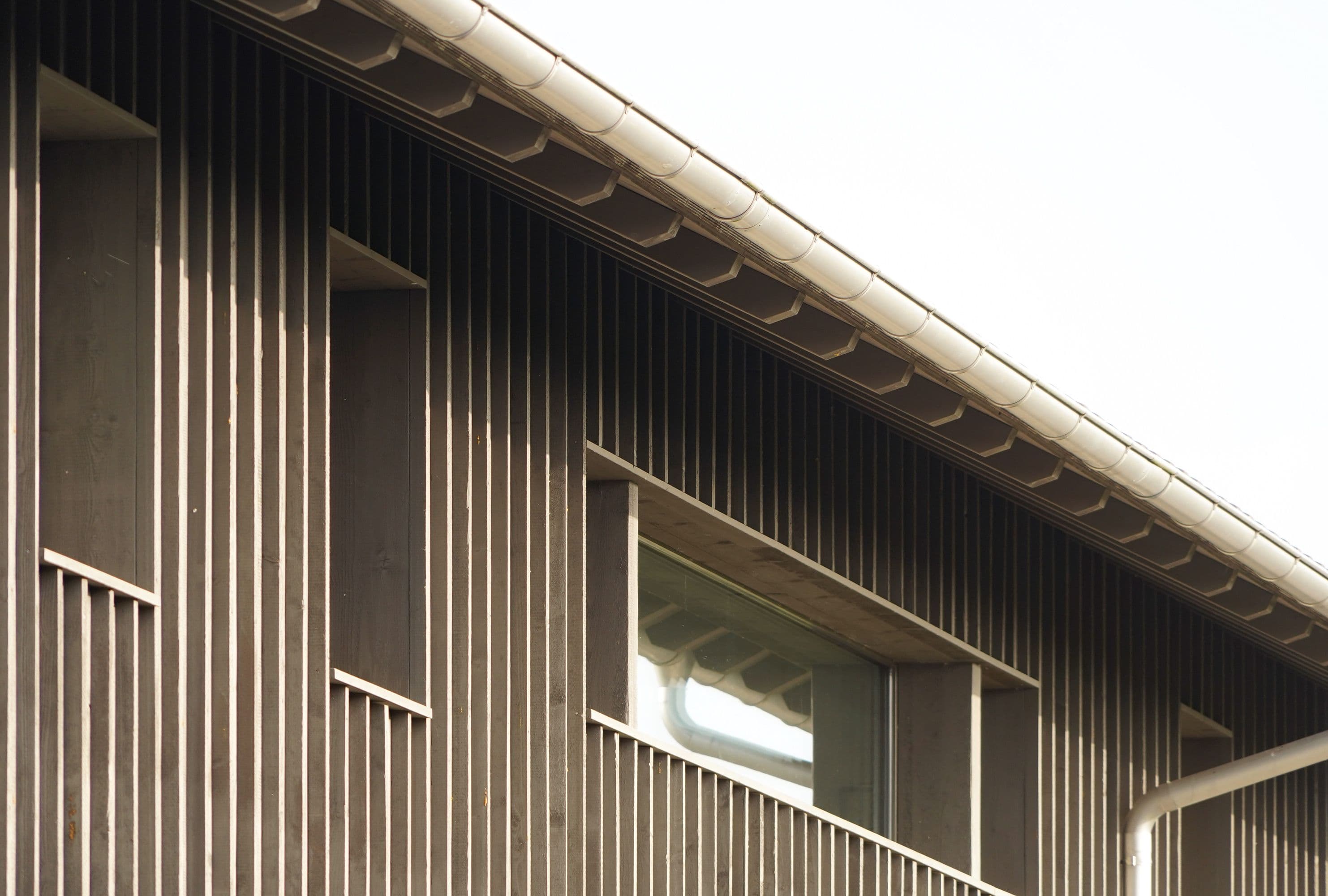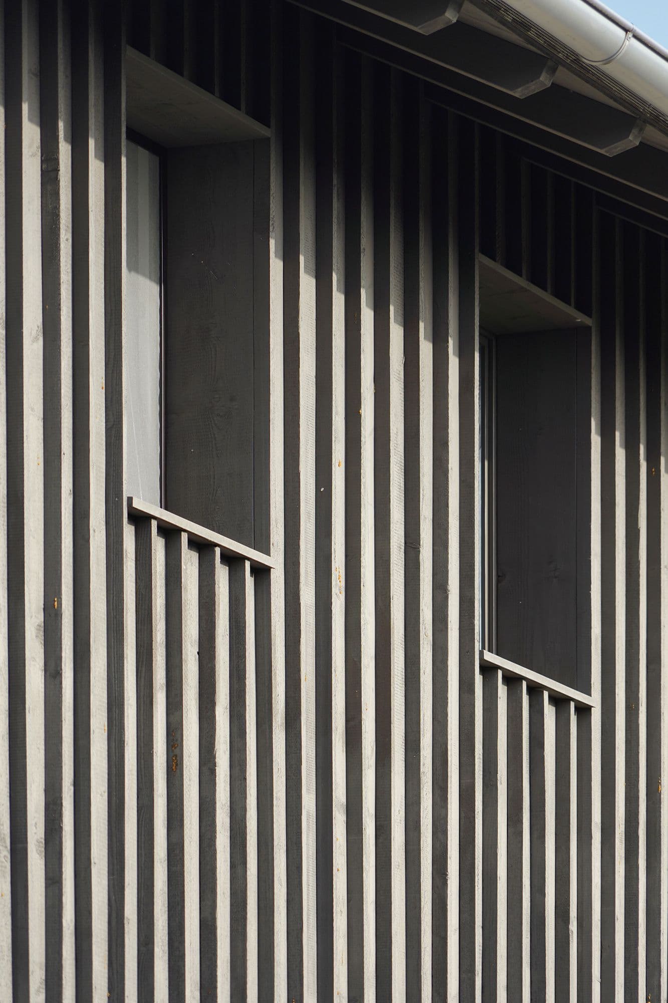 Auf den ersten Blick wirkt dieses Haus unscheinbar. Ein altes, längliches Industriegebäude, dem ein hölzerner Hut aufgesetzt wurde. Drinnen offenbart sich jedoch ein anderes Bild: ein lichtdurchflutetes Wohnhaus mit einem offenen Wohnzimmer, einem schwarzen, modernen Kern mit Küche und Holztreppe sowie einem Obergeschoss mit zwei Zimmern, einem Büro und einer prägnanten Holzbalkendecke. Der Fassade aus Fichtenholz wurde ein schlammfarbener Anstrich verpasst, was das Gebäude modern wirken lässt.