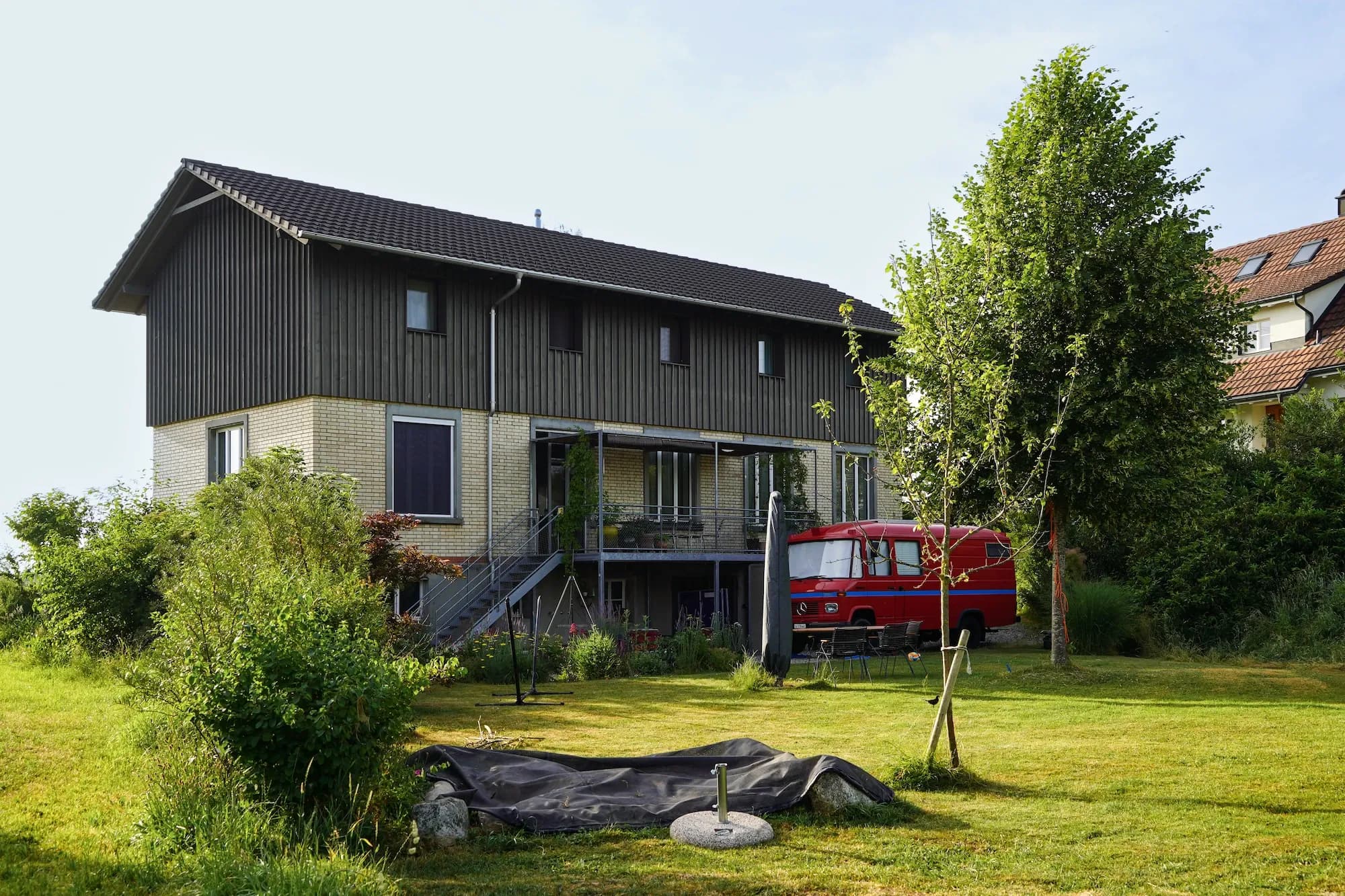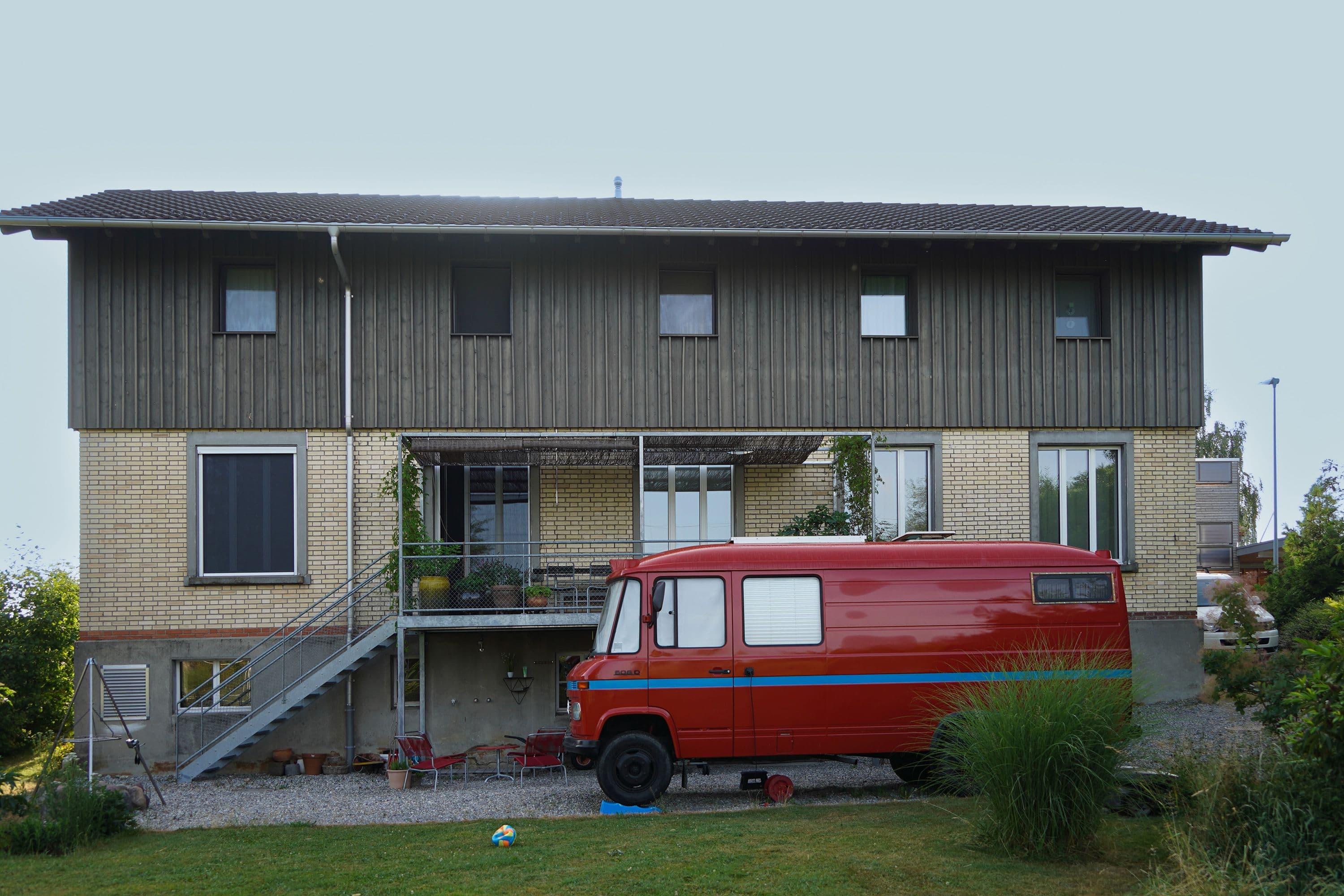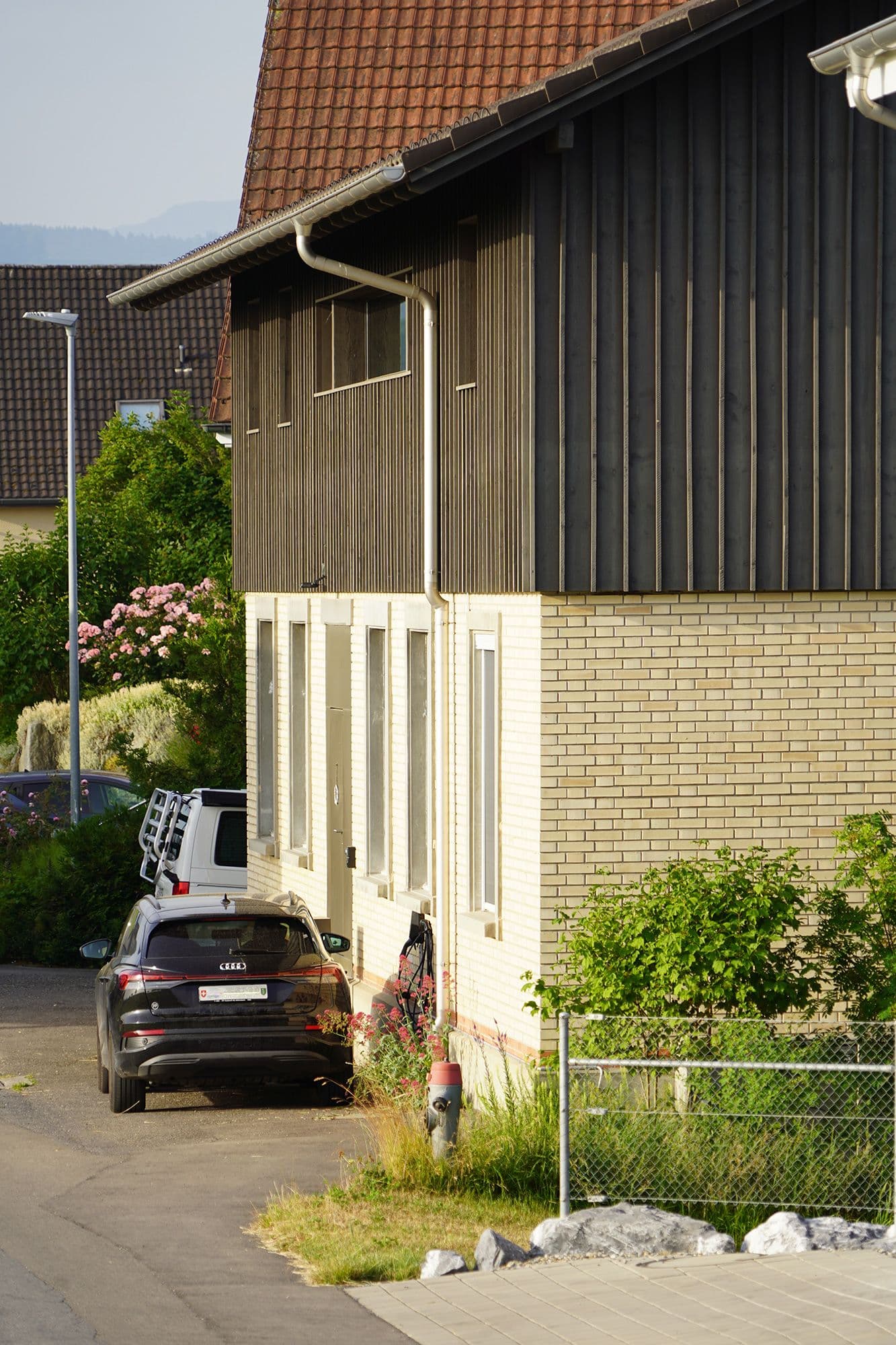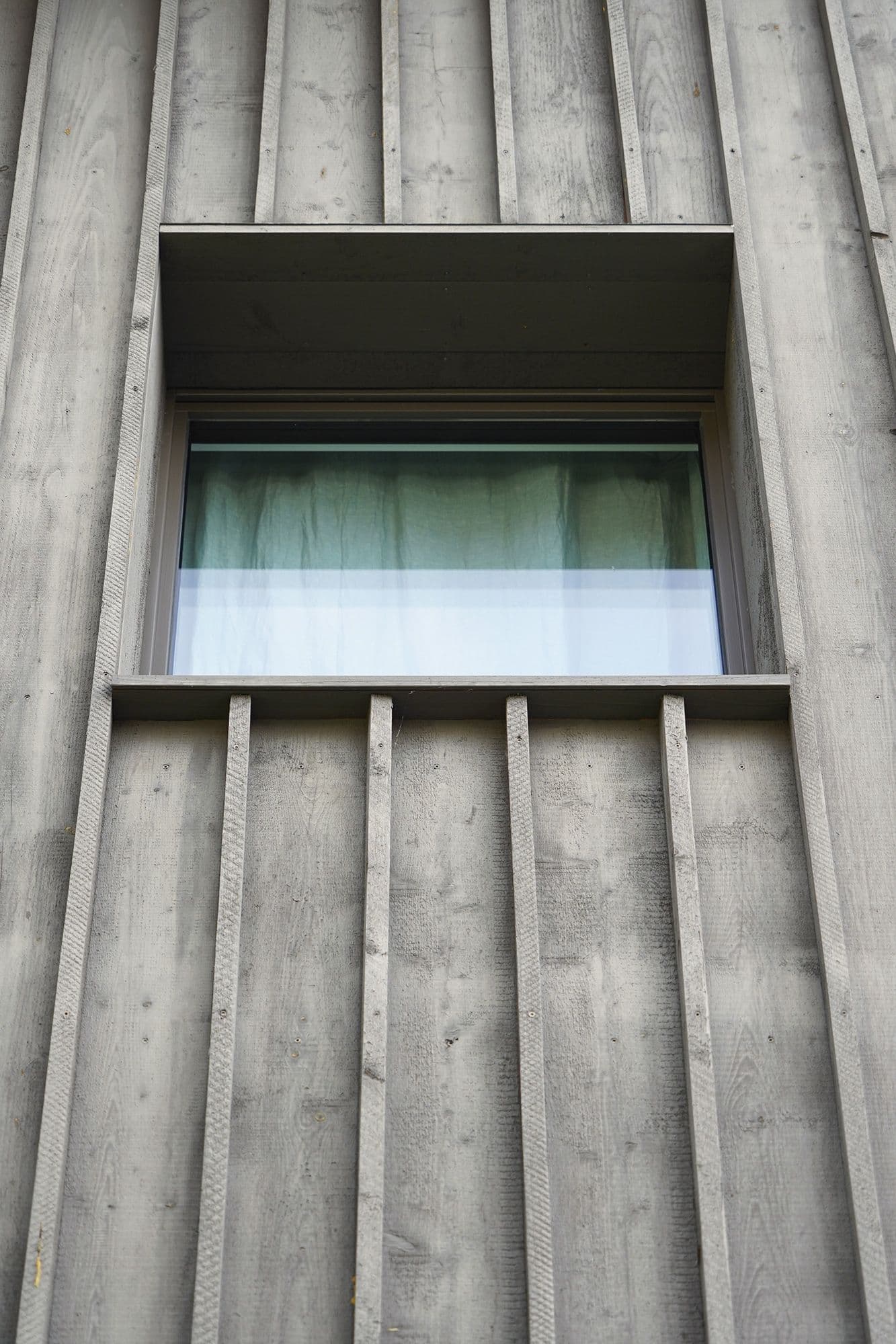 Auf den ersten Blick wirkt dieses Haus unscheinbar. Ein altes, längliches Industriegebäude, dem ein hölzerner Hut aufgesetzt wurde. Drinnen offenbart sich jedoch ein anderes Bild: ein lichtdurchflutetes Wohnhaus mit einem offenen Wohnzimmer, einem schwarzen, modernen Kern mit Küche und Holztreppe sowie einem Obergeschoss mit zwei Zimmern, einem Büro und einer prägnanten Holzbalkendecke. Der Fassade aus Fichtenholz wurde ein schlammfarbener Anstrich verpasst, was das Gebäude modern wirken lässt.