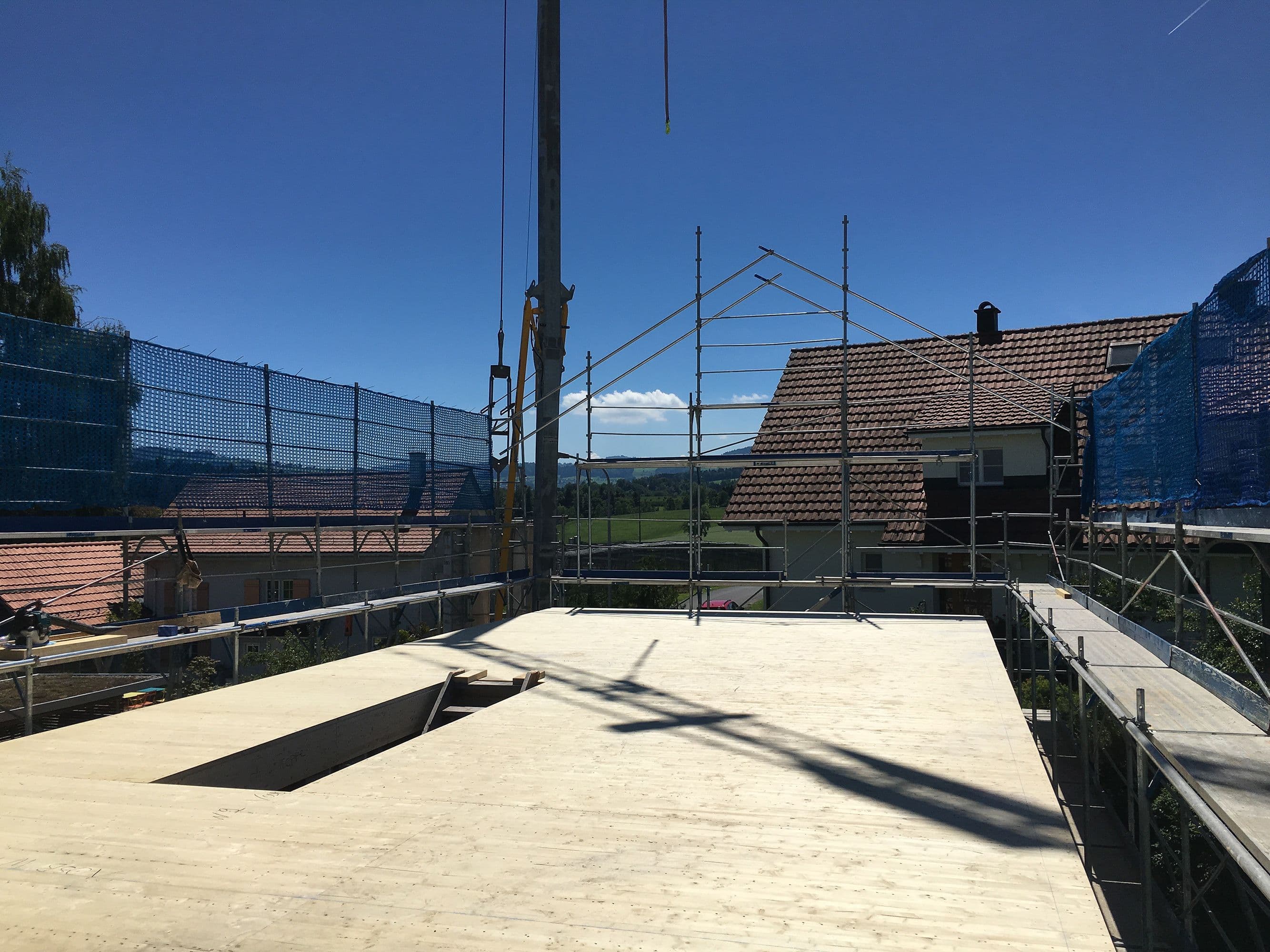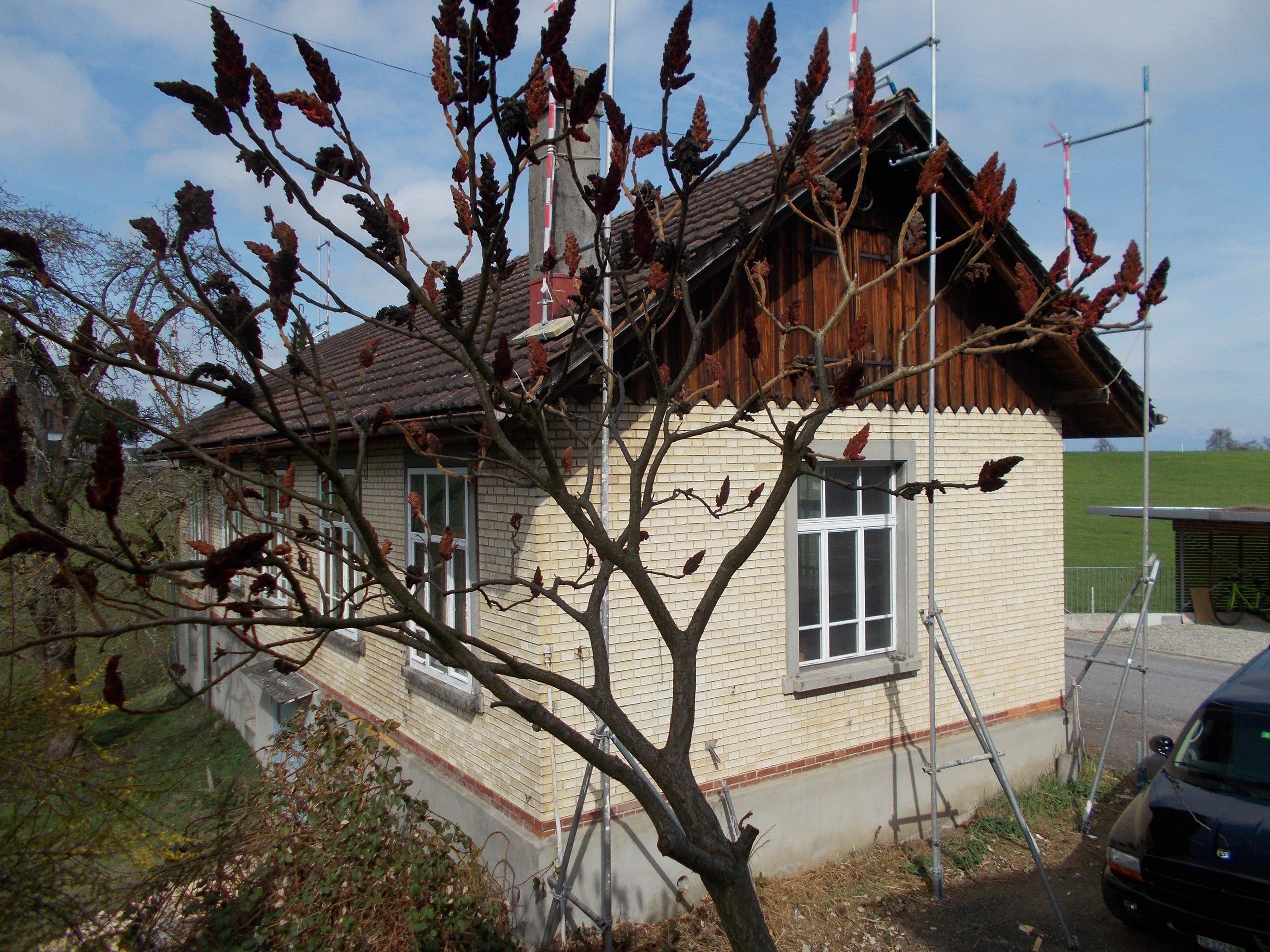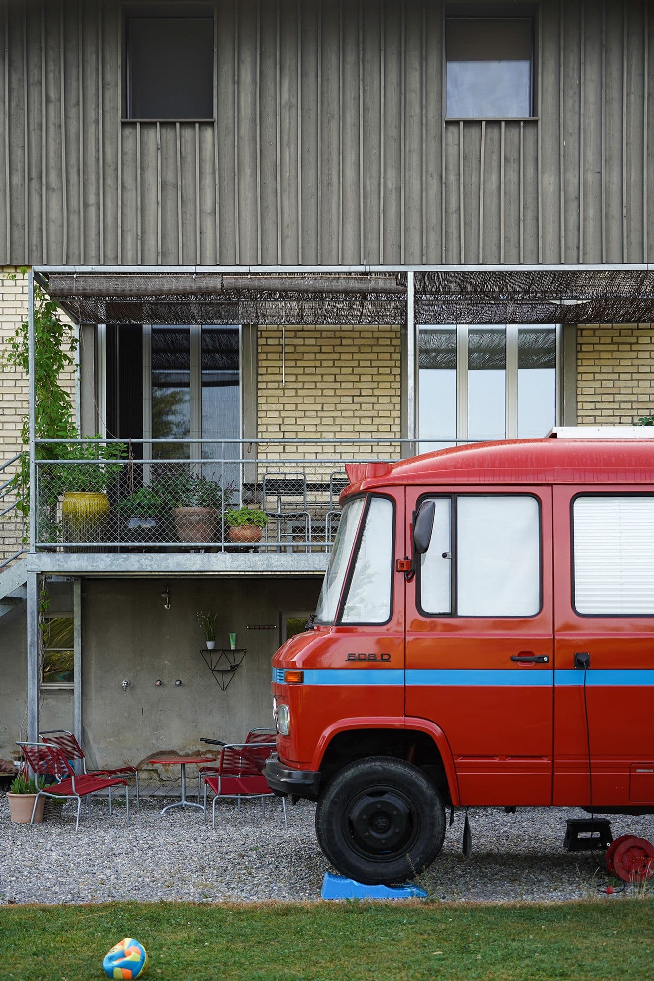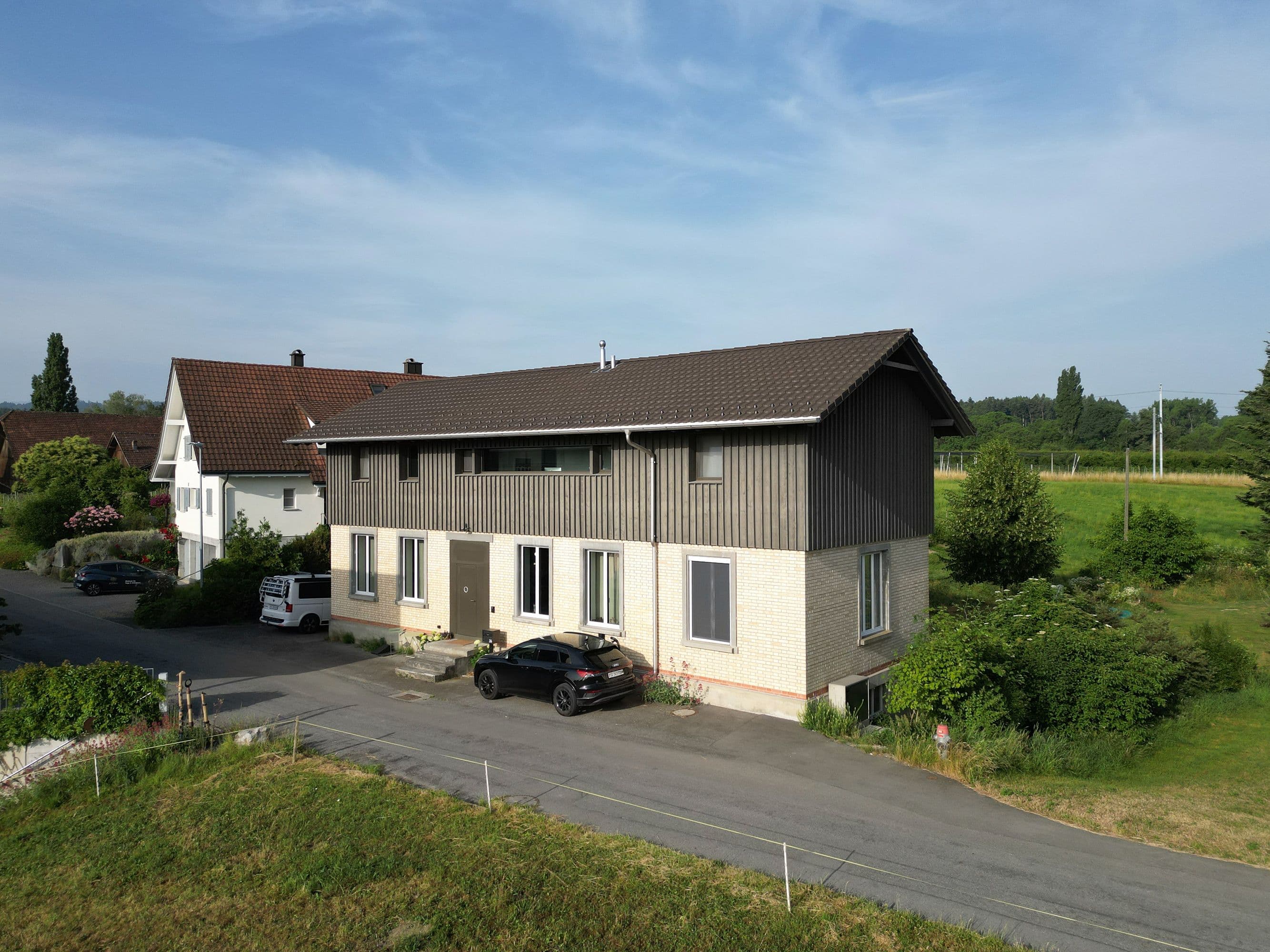 Auf den ersten Blick wirkt dieses Haus unscheinbar. Ein altes, längliches Industriegebäude, dem ein hölzerner Hut aufgesetzt wurde. Drinnen offenbart sich jedoch ein anderes Bild: ein lichtdurchflutetes Wohnhaus mit einem offenen Wohnzimmer, einem schwarzen, modernen Kern mit Küche und Holztreppe sowie einem Obergeschoss mit zwei Zimmern, einem Büro und einer prägnanten Holzbalkendecke. Der Fassade aus Fichtenholz wurde ein schlammfarbener Anstrich verpasst, was das Gebäude modern wirken lässt.
