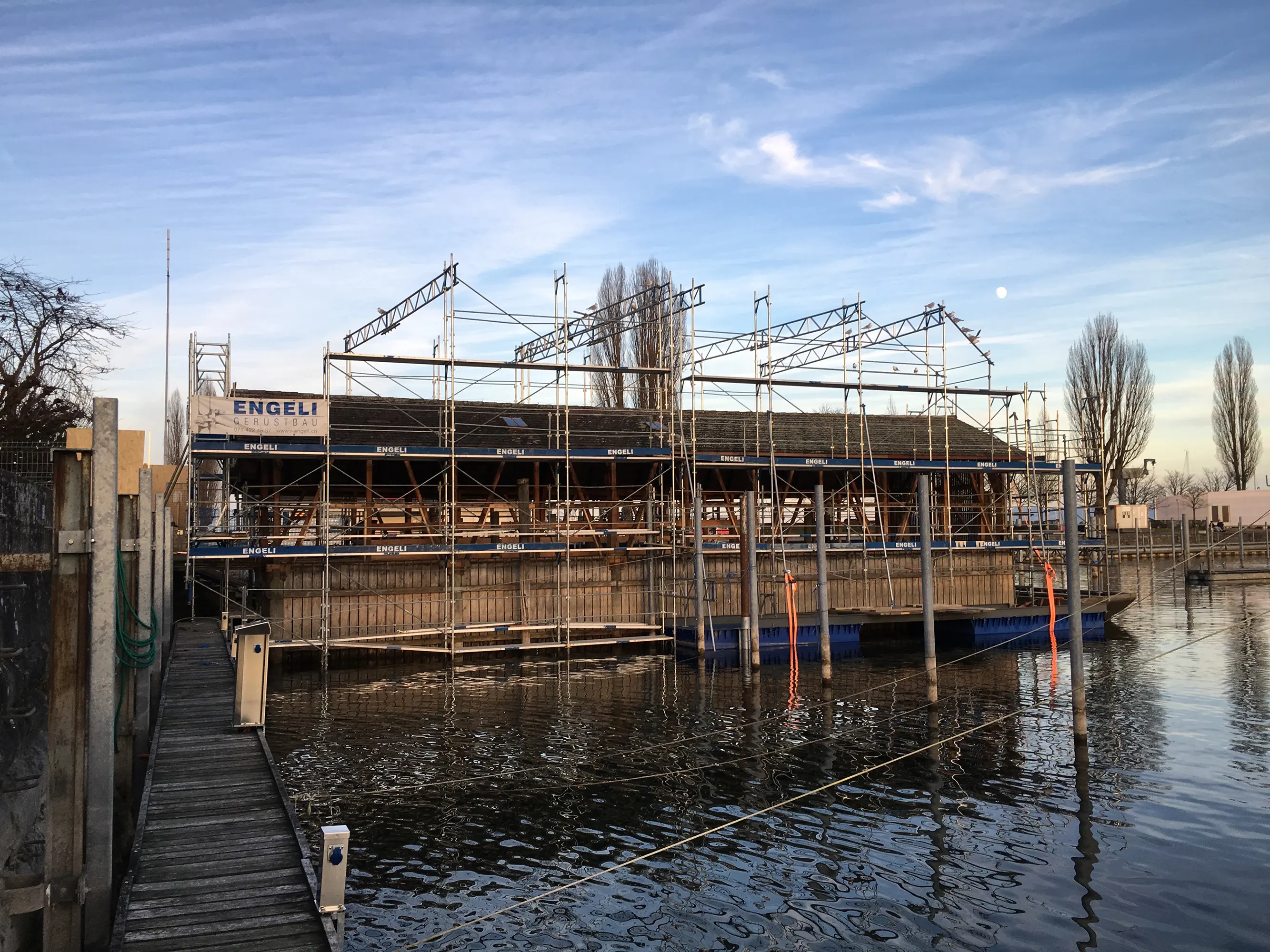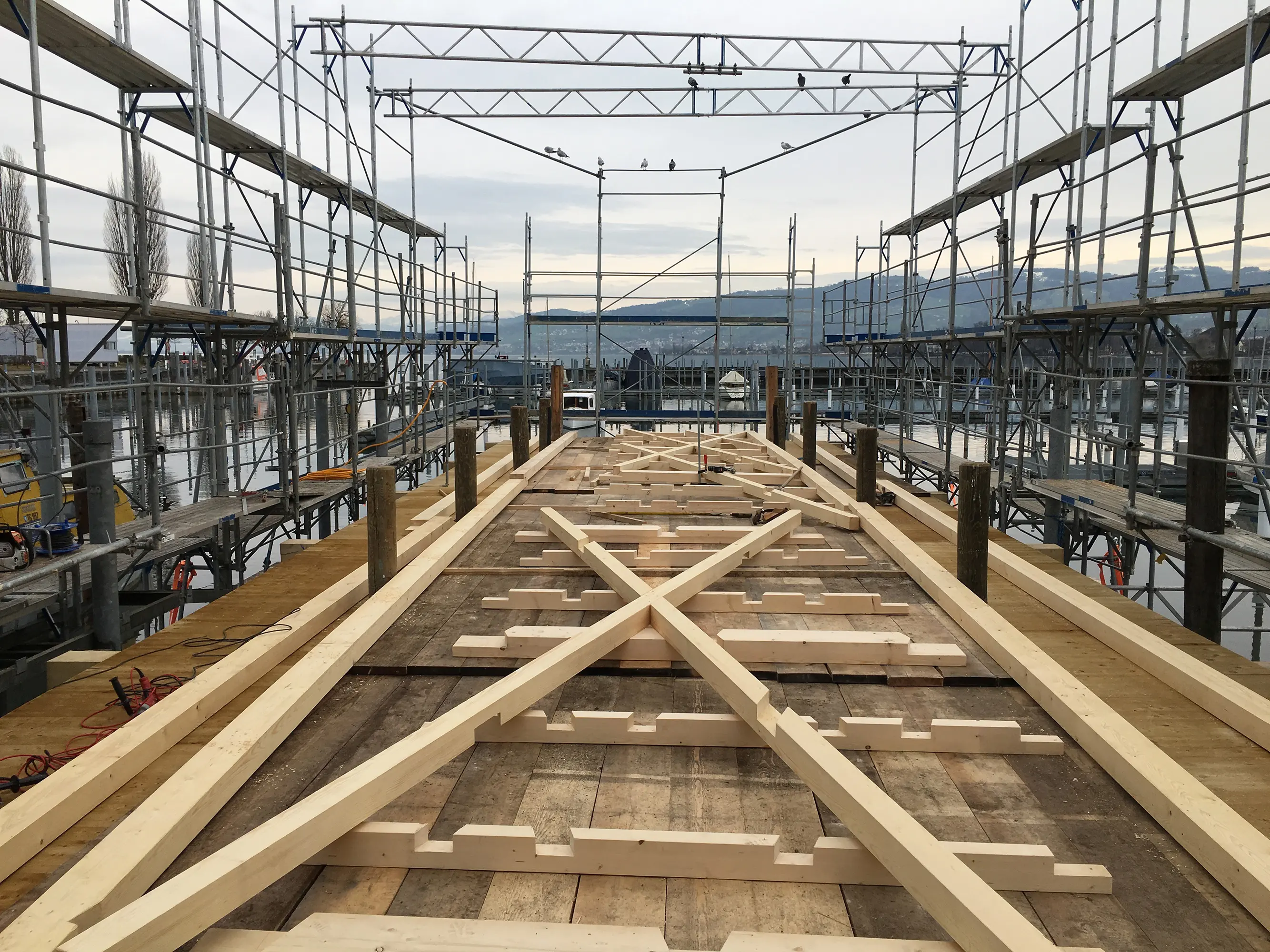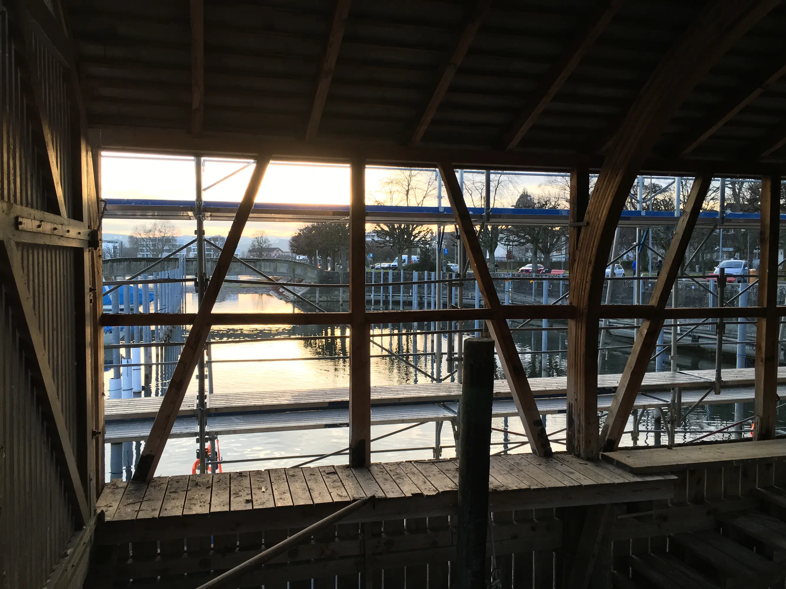 Zu eng war der alte, zu tief und zu schief. Also bauten wir das alte Bootshaus, welches auf gerammten Holzpfählen im Uferbereich steht, Bogen für Bogen auseinander. Wir ersetzten, was nicht mehr verwendet werden konnte und bauten das Bootshaus neu auf.