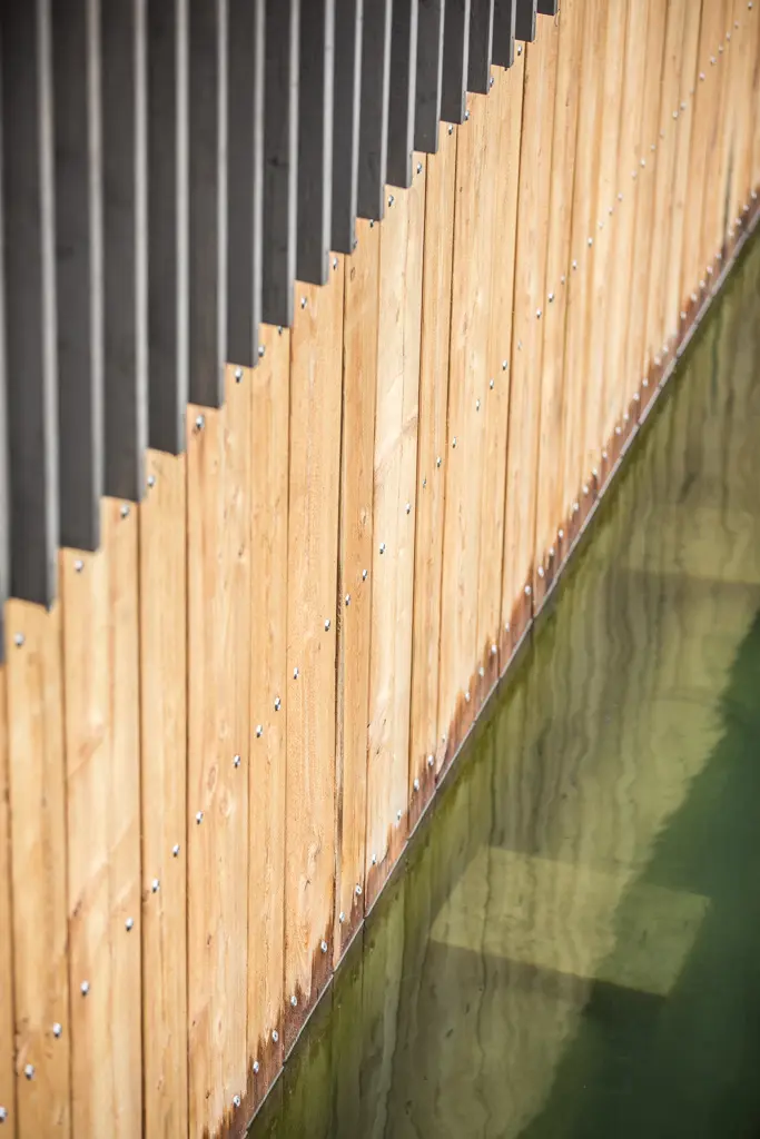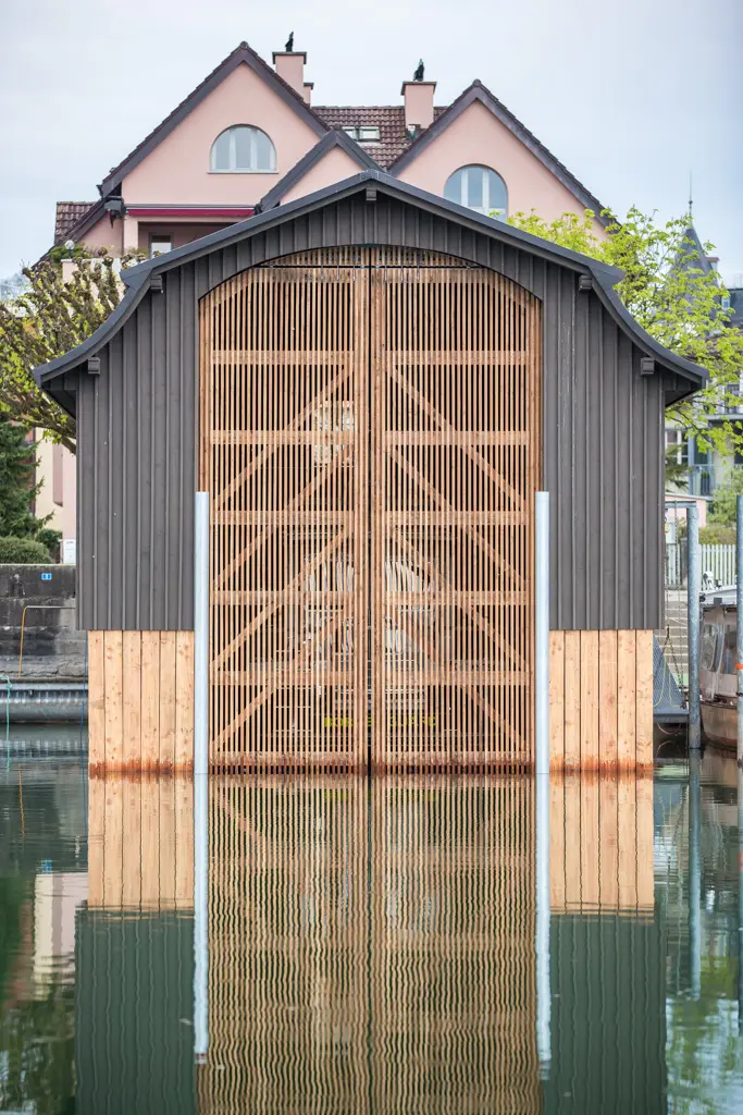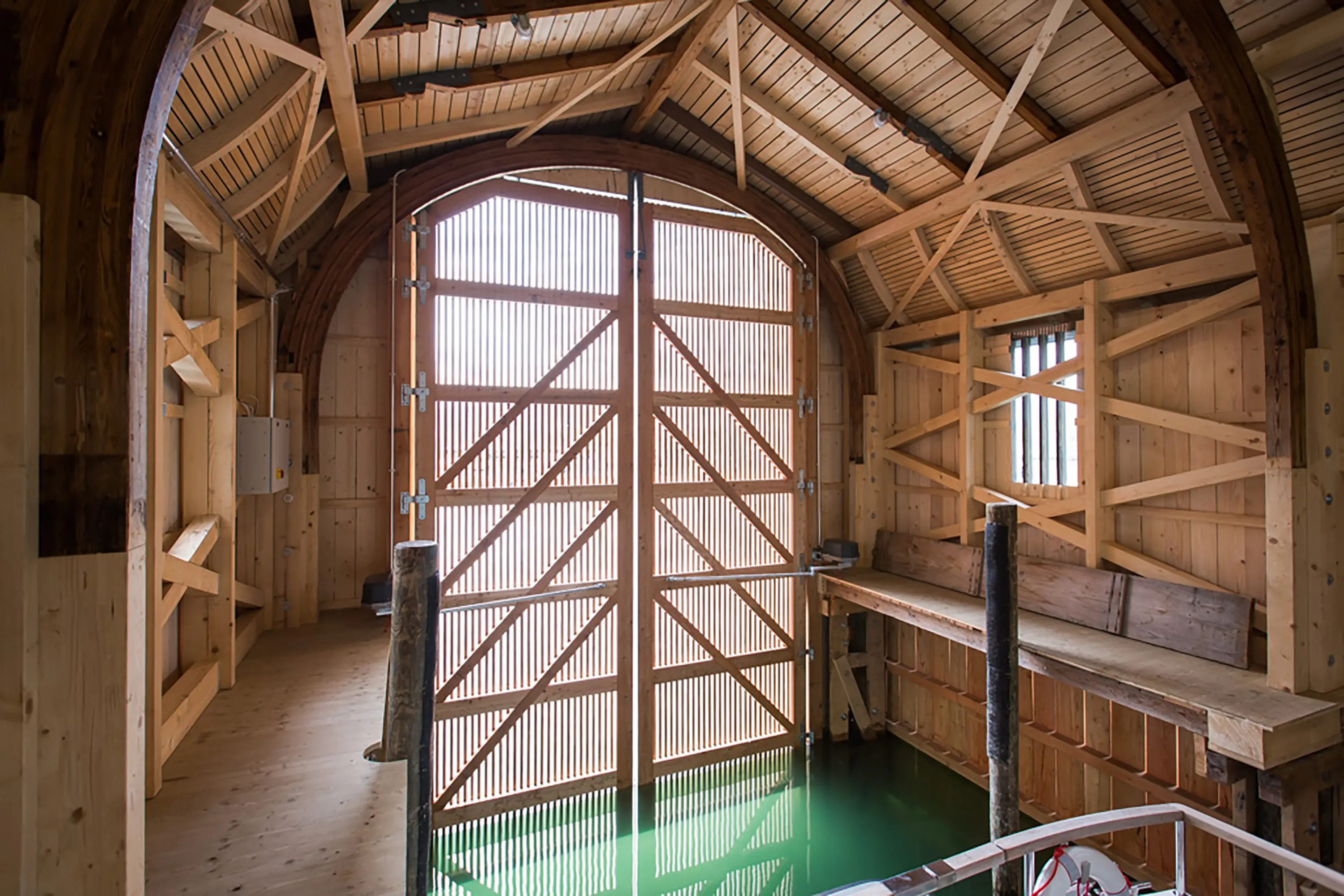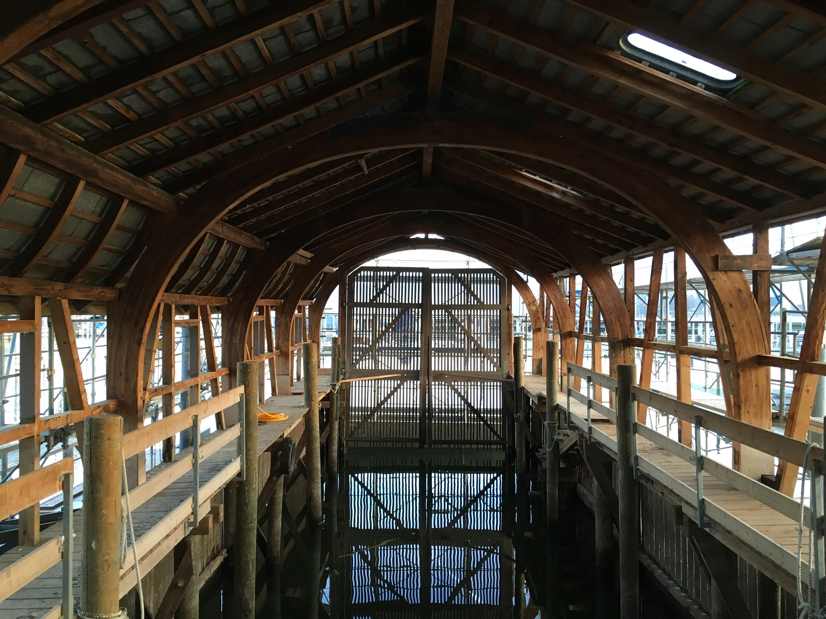 Zu eng war der alte, zu tief und zu schief. Also bauten wir das alte Bootshaus, welches auf gerammten Holzpfählen im Uferbereich steht, Bogen für Bogen auseinander. Wir ersetzten, was nicht mehr verwendet werden konnte und bauten das Bootshaus neu auf.